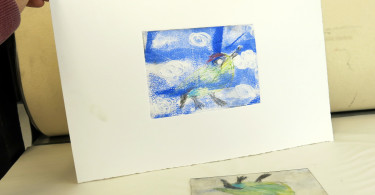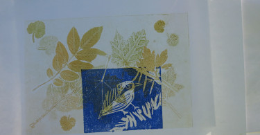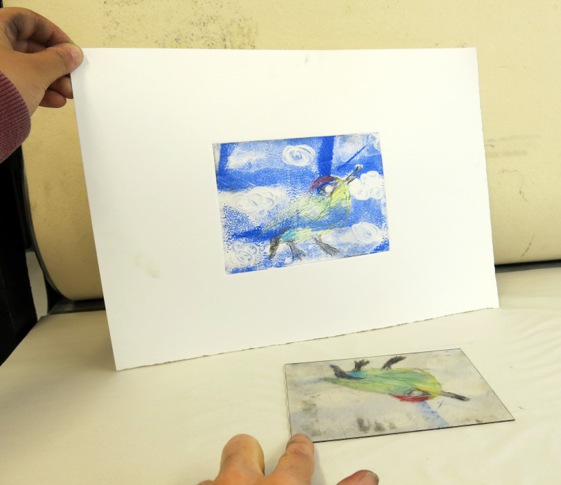 Vi ville också att några verk skulle bli kollektiva så vi målade och valsade färg på stora tryckark. Där sedan var och ens fåglar trycktes. På monotypierna med växter trycktes vi också fåglarna i både högtryck och djuptryck.