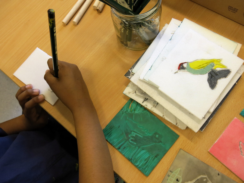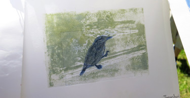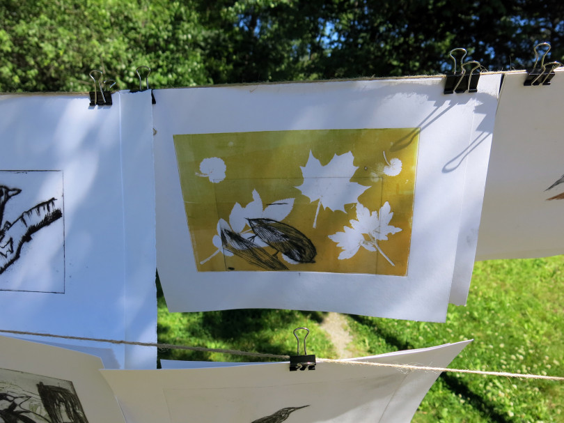 Det allra första vi la på tryckbädden och drog genom pressen var små blommor vi plockade utomhus. Och fick en blomma i tunna färger som resultat på papperet. Vi fortsatte att plocka växter i skogsdungarna runt om husen. Valsade den vattenlösliga färgen Agua Intaglio på plastskivor, arrangerade växterna på skivan och tryckte. Vände på växterna och gjorde flera eftertryck. Ett gemensamt tema för både grafiken och keramiken tog form och det kom att bli fåglar. De fåglar vi hade runt knuten och i trädgården på Husby Gård studerades och avbildades i torrnålsteknik, linoleum och cellplast, ett enkelt material för de yngsta att trycka högtryck med. Man bara ritar med pennan i den mjuka plasten som blir nedtryckt.