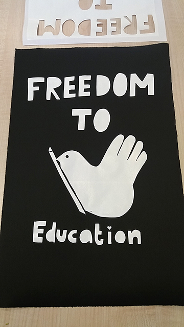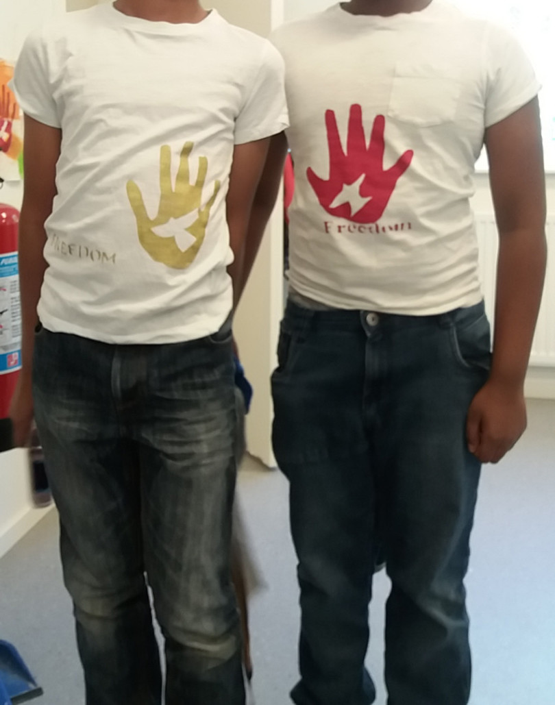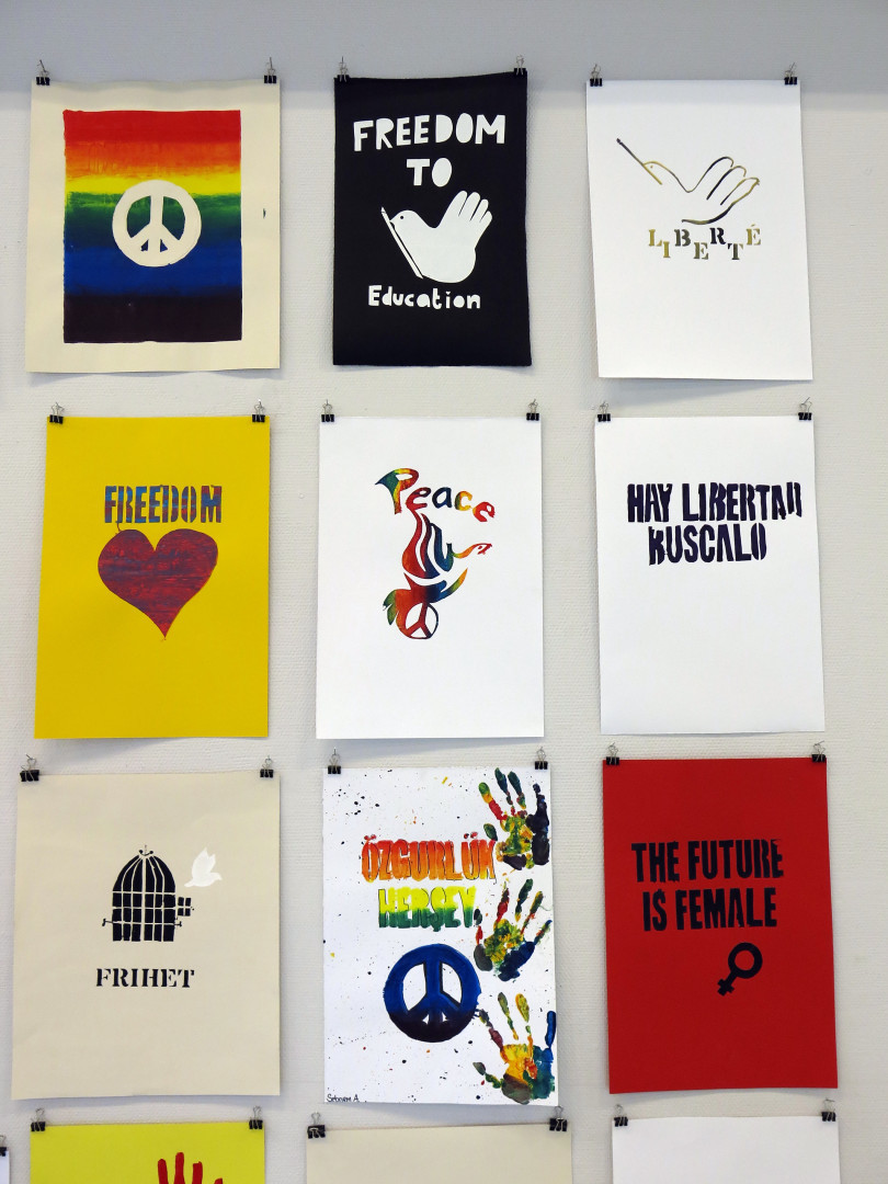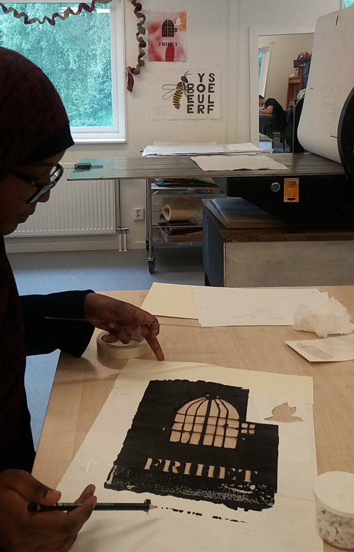 Vi har tryckt affischer och banderoller i screentrycksteknik. Barnen och ungdomarna har också tryckt på T-shirts. Schabloner i papper skars vilket innebär en extra utmaning i hur man planerar bild/text för uttrycket. Att skära schabloner tränar också det hantverksmässiga kunnandet. Vi har också arbetat med andra grafiska tekniker och gjort flera gemensamma verk. Intresset bland de barn och ungdomar som deltog var stort för just ämnet och tekniken.