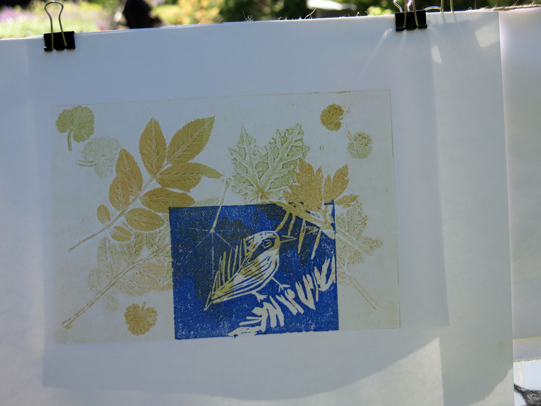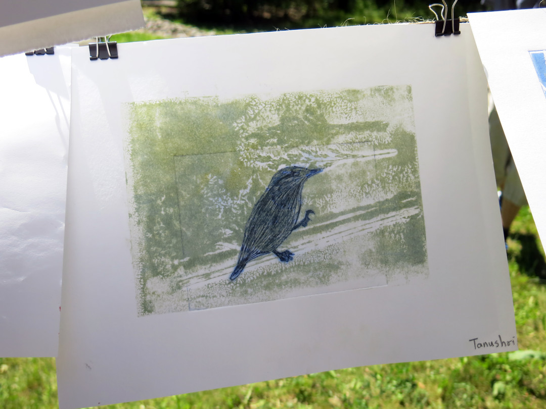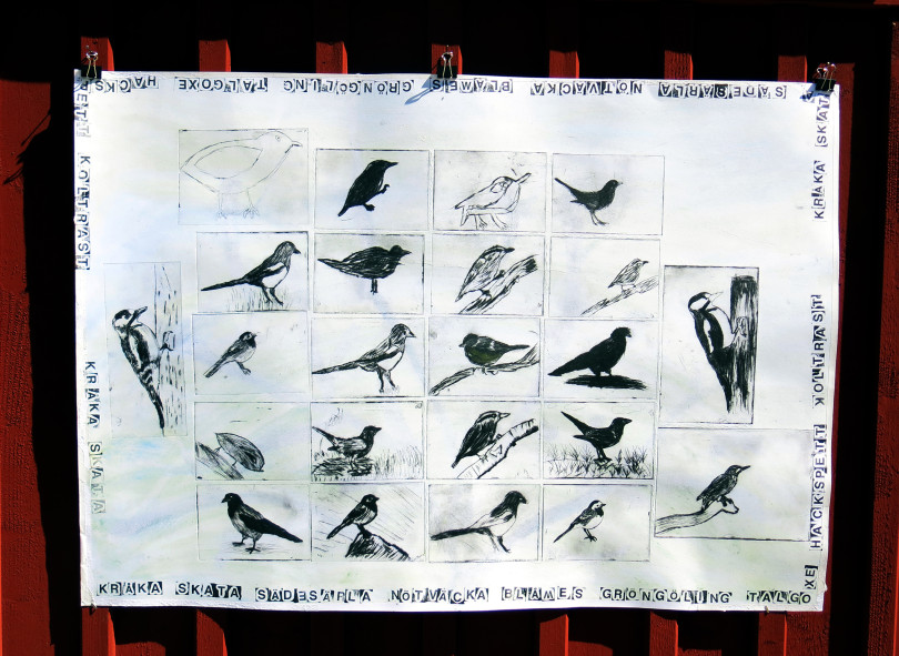 Det allra första vi la på tryckbädden och drog genom pressen var små blommor vi plockade utomhus. Och fick en blomma i tunna färger som resultat på papperet. Vi fortsatte att plocka växter i skogsdungarna runt om husen. Valsade den vattenlösliga färgen Agua Intaglio på plastskivor, arrangerade växterna på skivan och tryckte. Vände på växterna och gjorde flera eftertryck. Ett gemensamt tema för både grafiken och keramiken tog form och det kom att bli fåglar. De fåglar vi hade runt knuten och i trädgården på Husby Gård studerades och avbildades i torrnålsteknik, linoleum och cellplast, ett enkelt material för de yngsta att trycka högtryck med. Man bara ritar med pennan i den mjuka plasten som blir nedtryckt.