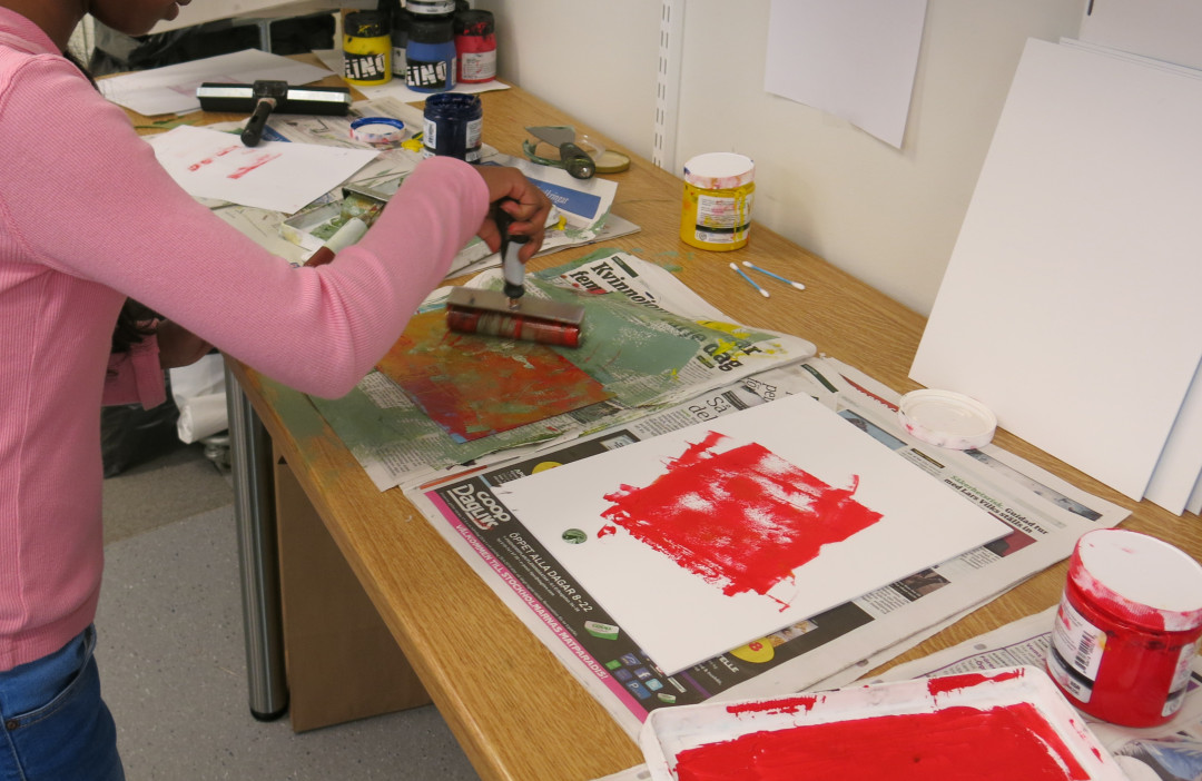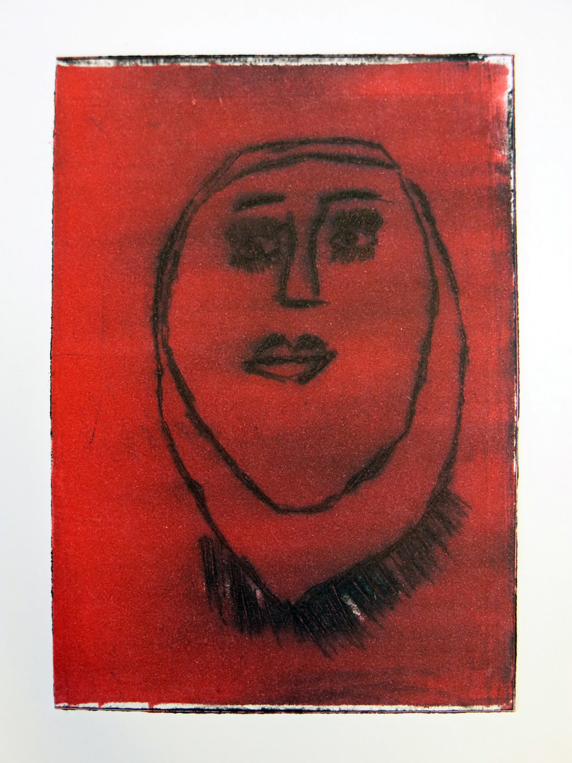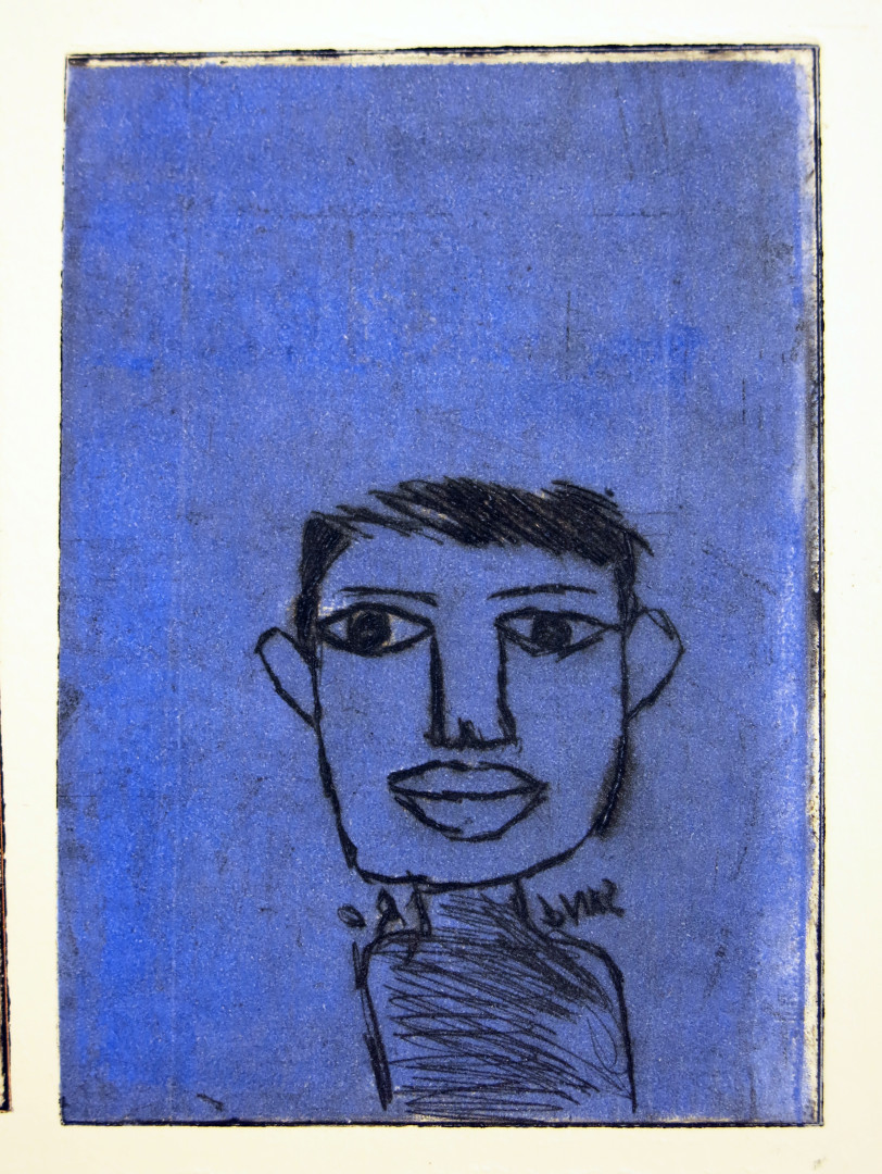 En eftermiddag hade vi besök av en grupp ungdomar i Röda Korsets regi. De gjorde kamratporträtt i torrnålsplast. Suomia och jag färgade in plåtarna, ungdomarna valsade färg över och tryckte.