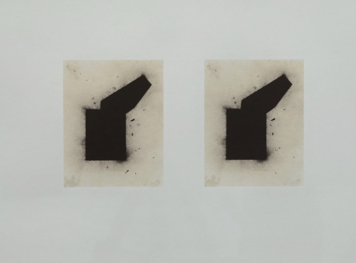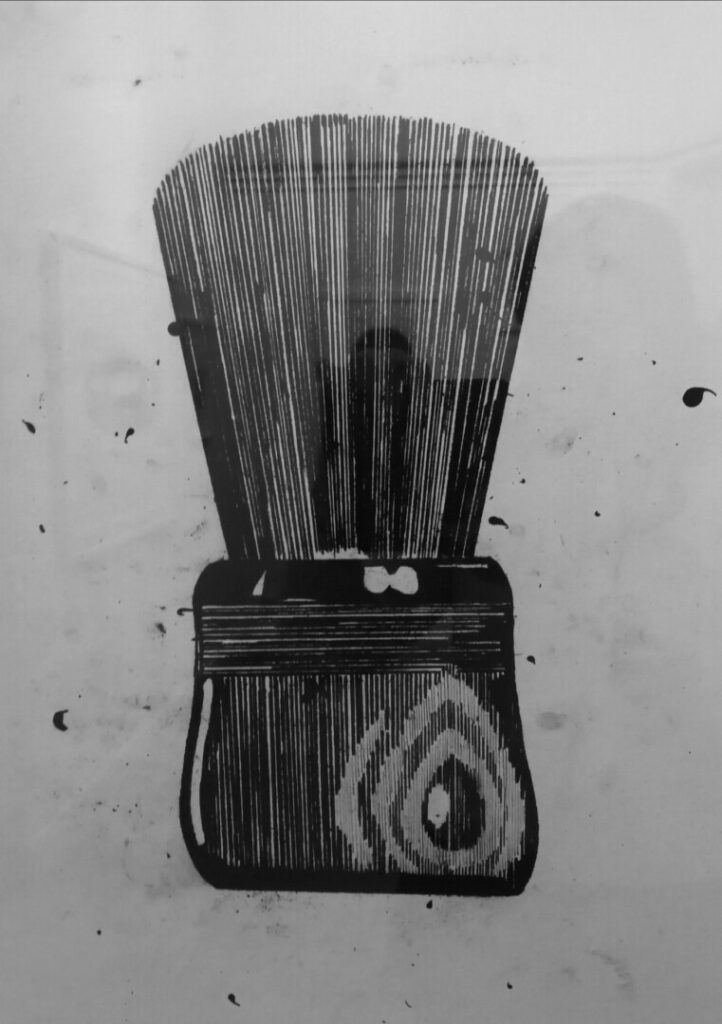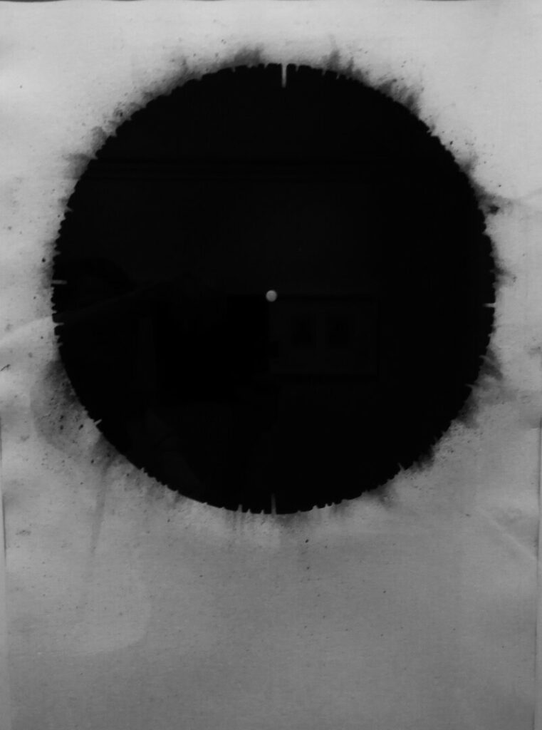 Ett av högtrycken i kol är ett tryck från en bearbetad LP-skiva som blir till en mycket svart sol och som avslutning vill jag nämna objektet Huv med meteoriter som liknar en del av en bilkaross med stenskott!