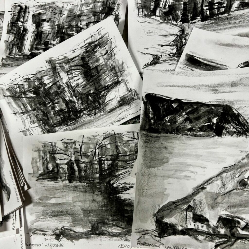 I løbet af den måned jeg var i Kambans hus besøgte jeg flere øer, bl.a. Svínoy, hvor min farmor var født og havde sin opvækst. Her fik jeg lavet en hel del skitser og kultegninger. Skitserne og tegningerne ”fortæller” måske ikke alt hvad jeg oplevede, men det er gode huskebilleder jeg bruger som inspiration og udgangspunkt til nye malerier og grafiske værker.