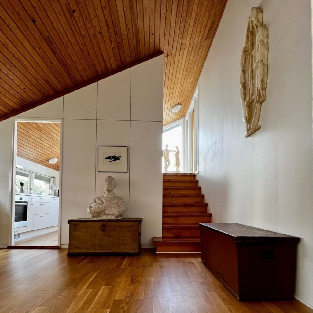 Arkitekt J. P. Gregoriussen (1932-2021) har tegnet huset med en tydelig kunstnerisk prioritering. Atelieret er klart husets største rum, ca. 40 kvm stort, med store østvendte vinduer og højt til loftet. Stuen er lille, hyggeligt indrettet og har en smuk udsigt over fjorden ud til Nólsoy.