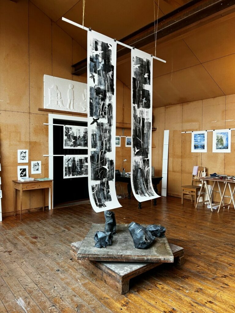 Det tog noget tid inden jeg for alvor kom i ”arbejdsflow”. Jeg havde brug for at finde mig til rette og suge til mig af indtryk både inde i atelieret og udenfor i landskabet. Derfor var det godt med et længerevarende ophold.