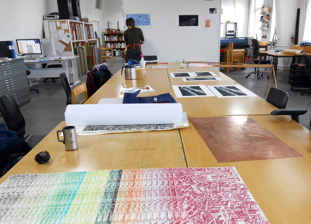 Utifrån ett stort antal torrnålstryck, ibland tio till tjugo stycken, från samma plåt, i ett brett spektra av nyanser, arbetar hon fram sin bild. Med vass skalpell skär hon sig in i blad efter blad, en filmisk ge- nomskinlighet uppstår samtidigt som det grafiska bladet erhåller en tredimensionell karaktär. En slags värld i dröm från det förflutna till framtiden där fragment flyter förbi i ständig rörelse, Knossostemplet på Kreta, inslag från en vistelse i Spanien eller celler i stark förstoring. Bladen limmas samman till en helhet vilket även det in- nebär koncentration och noggrannhet.