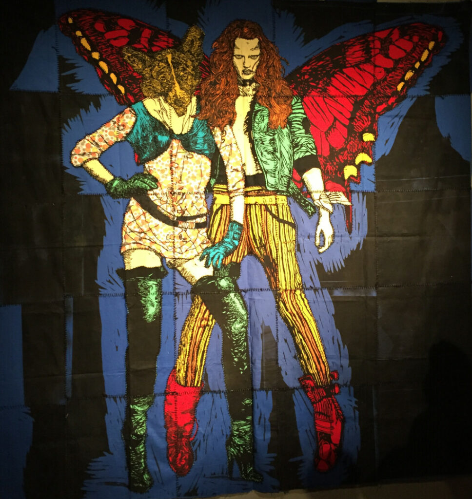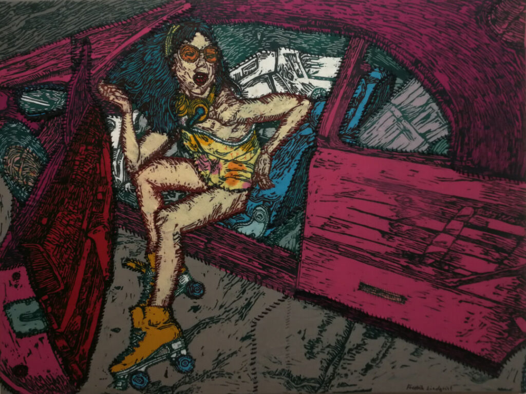 Lindqvist bilder drabbar en. Hans bilder tänjer på gränser och hjälper till att utvidga grafikbegreppet med den gamla tekniken träsnitt i kombination med tryck på textila bitar som han sytt ihop för hand.