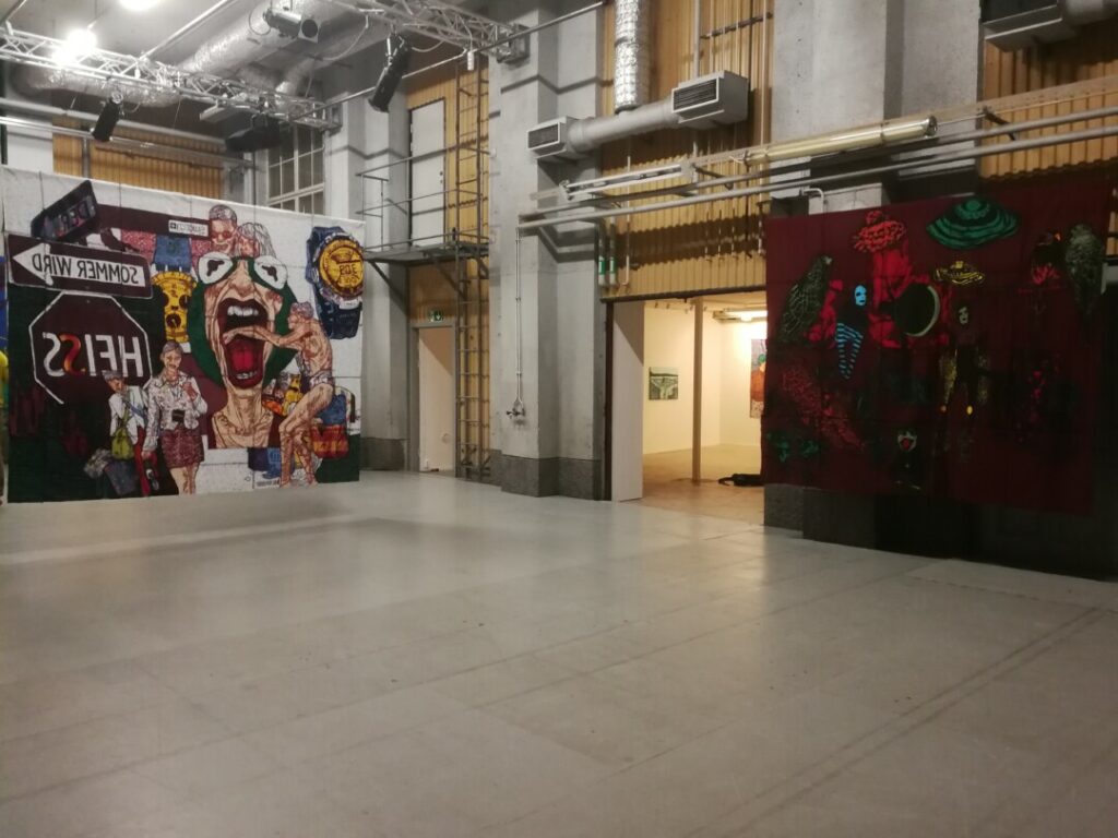 Bilderna är intressant och luftigt arrangerade genom hängningen från taket.  Utställningshallen innehåller tre utställningsrum.  I de två inre rummen finns mindre textila träsnitt monterade på ram.
