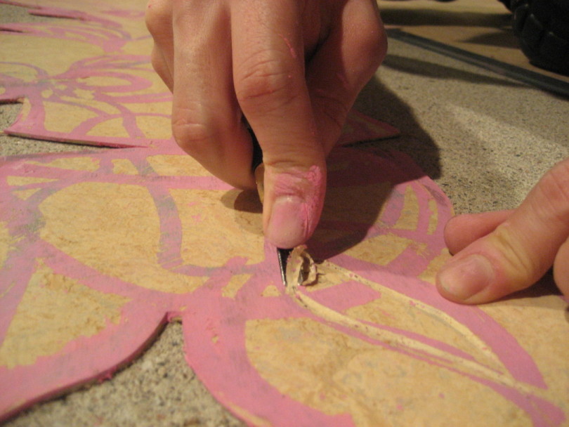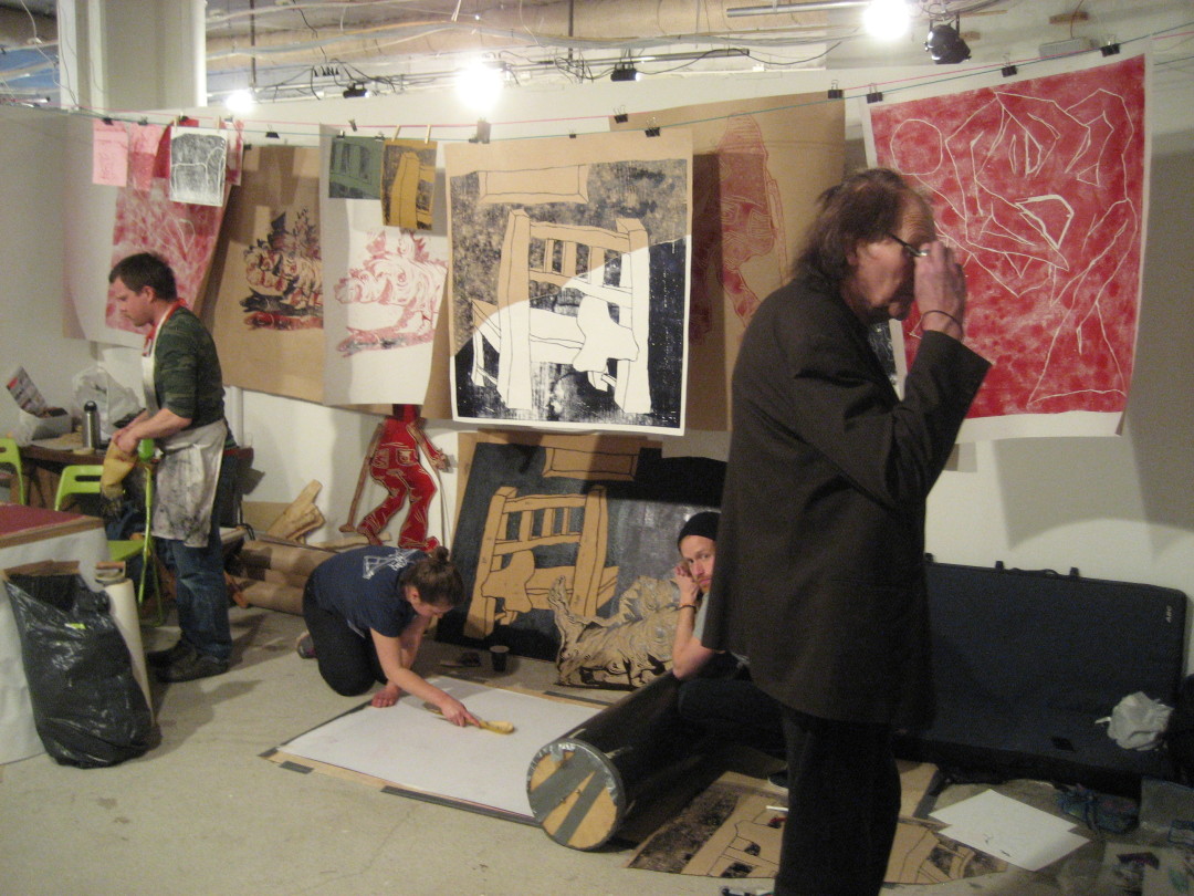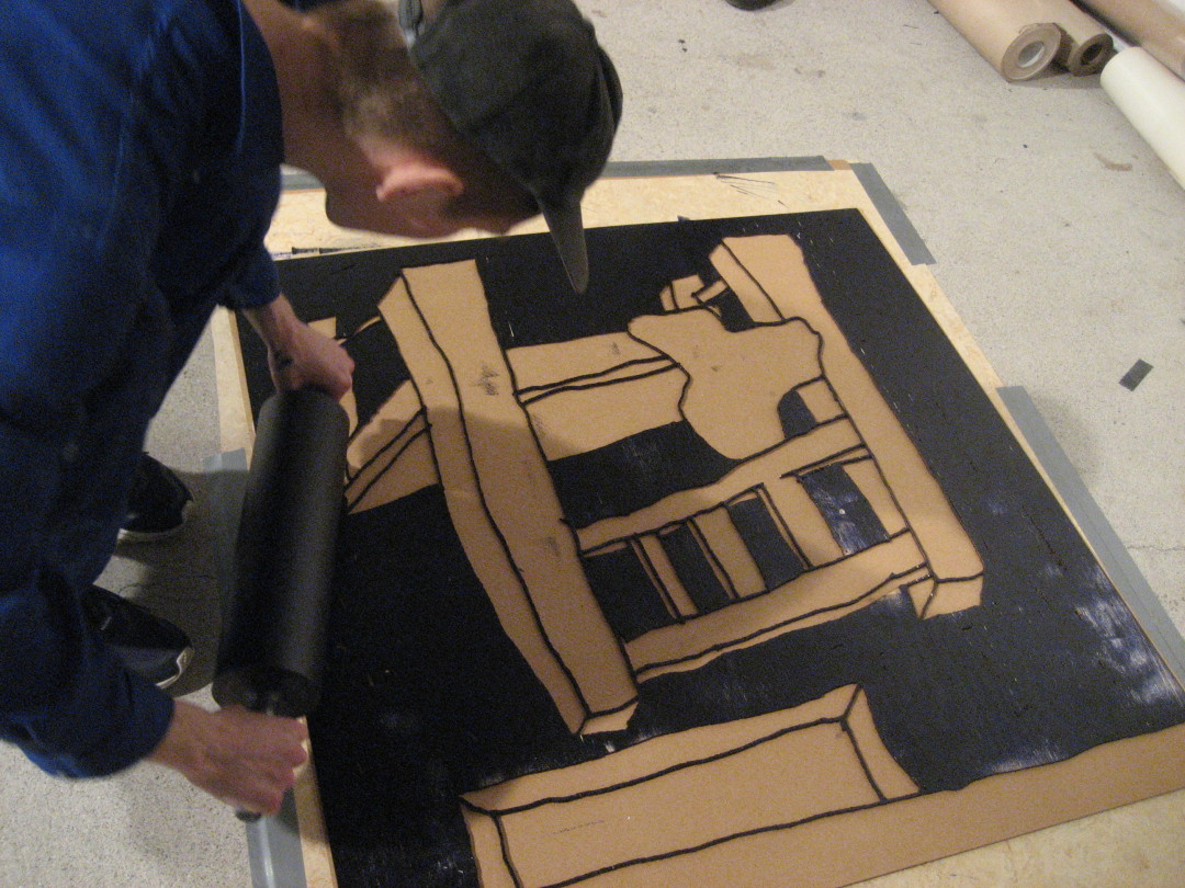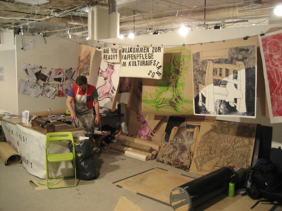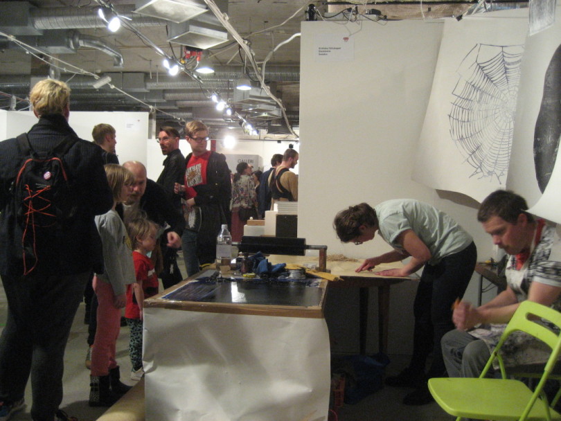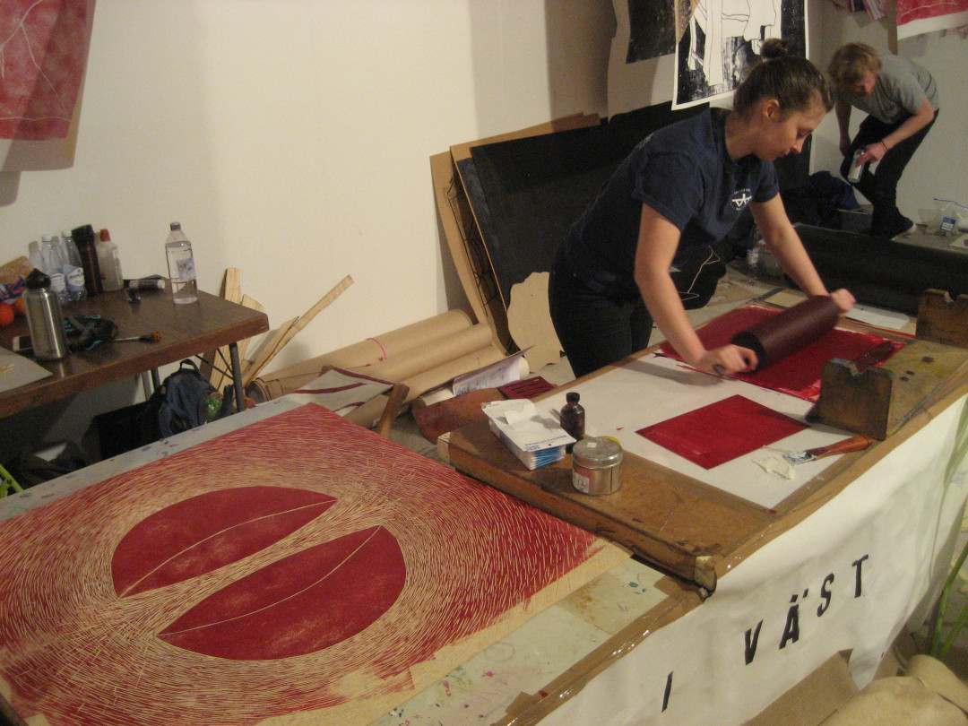 På onsdagen var det mingel och VIP-dag för de olika gallerierna på Supermarket. Vi startade klockan 11 och började valsa färg och skära linoleum ganska direkt.