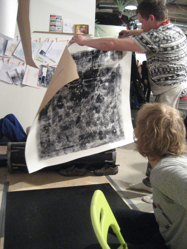 Resten av veckan fortlöpte med nya linoleumtryck, tryckta med den medtagna tryckpressen på golvet, tryck gjorda med enbart kroppstyngd och fanzine verkstad. Utbyte oss konstnärer emellan med tips och idéer, korsbefruktade uttryck. Reaktionerna från allmänheten och de andra gallerierna som var verksamma var rakt igenom positiva. Det blev många intressanta samtal och flertalet verkade motiverade att testa grafiska uttryck. Tanken var egentligen inte en workshop men vissa åskådare deltog även i karvandet i och tryckandet av linoleumet.