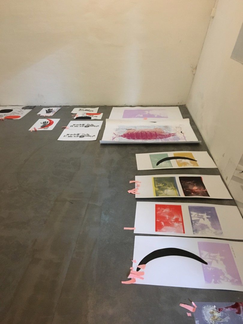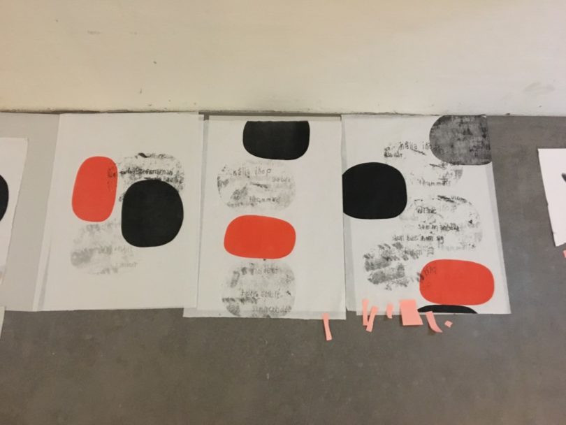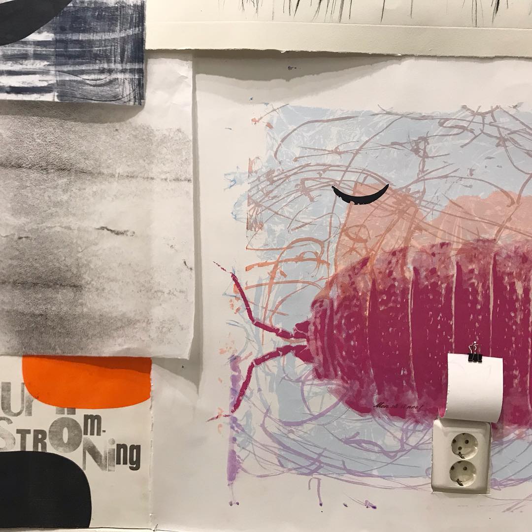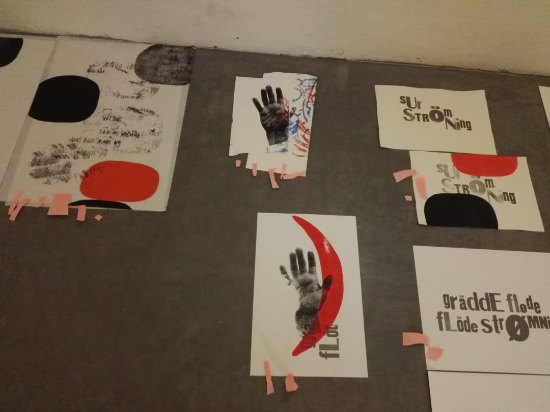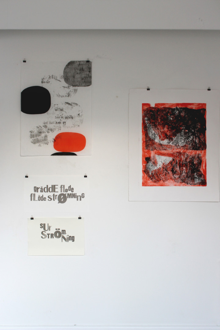Opportunities for artists to make connections with others working with similar practices can be rare, even between countries as geographically close as Denmark and Sweden. The Grafisk Udveksling project was an important initiative to bring together a number of artists working in the field of printmaking together to trade ideas, techniques, and above all to build a community. Getting to know each other, and being introduced to everyone’s art, was full of surprises — but the real excitement came in the process of making, at KKV in Malmö. The hallway rapidly filled with experiments, collaborations, pieces waiting for another layer, and those deemed finished. The prints stretched the length of the corridor, on both sides. It was an outpouring of creativity. The main work of community-building happened in these moments, with dirty hands and ideas, over tea and cake. And I think the enthusiasm can be seen in the work, its variety and life.