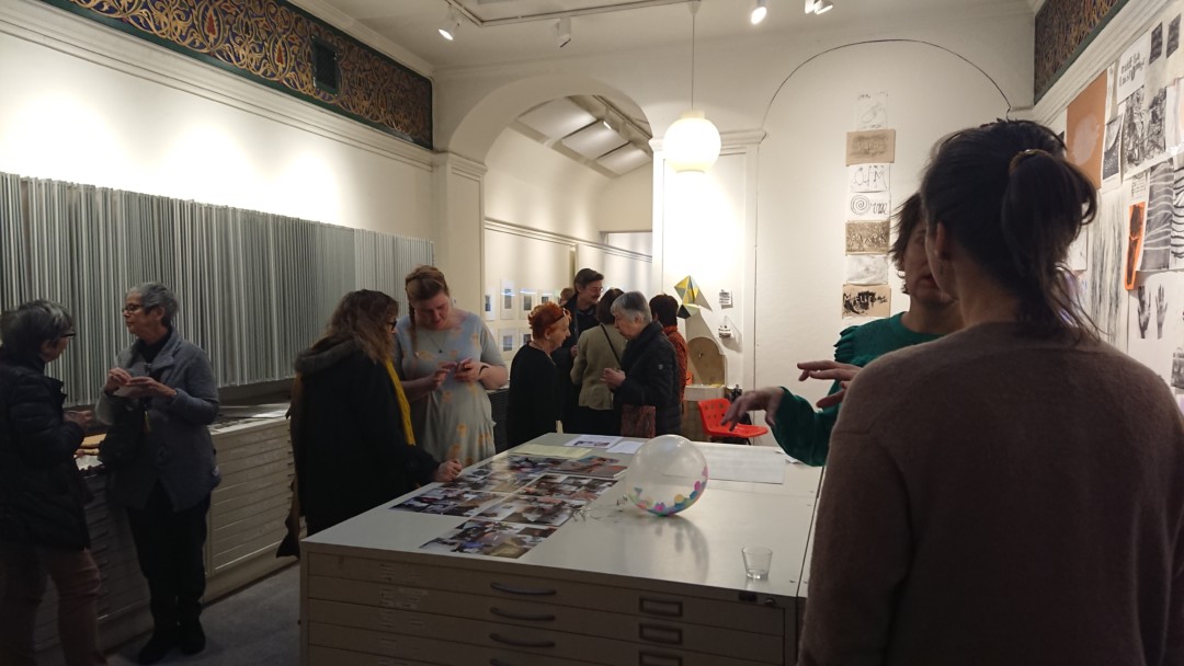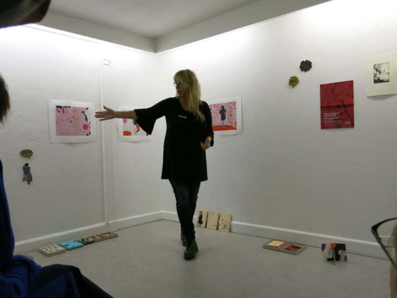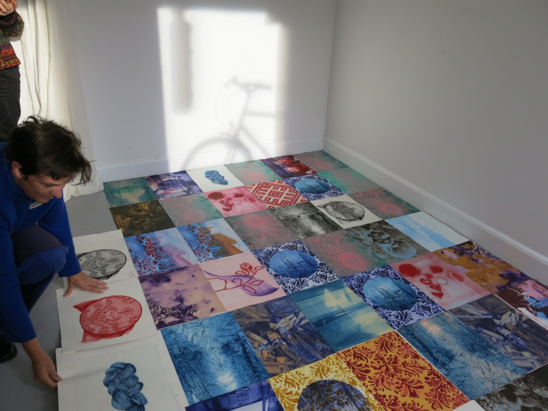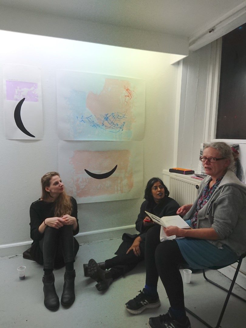 Flera hade förberett en performance, andra valde att sätta upp eller lägga sina bilder på olika sätt utifrån rummet och sen prata om bilderna. Lite läskigt att vara sist. Men jag satte upp mina (färgglada) bilder i rummet på olika nivåer och berättade hur jag jobbar. Det var ett mycket effektivt sätt att presentera oss för varandra. Det funkade väldigt bra på grund av Grafikeres hus uppbyggnad med två rum på olika våningar. I pauserna fick vi Åses goda hembakta kakor med kaffe och senare ärtsoppa. Det höll också energin uppe.