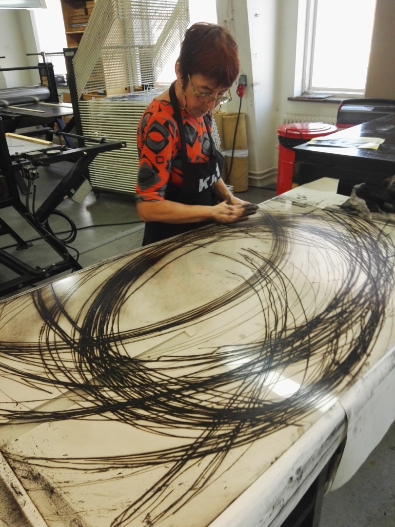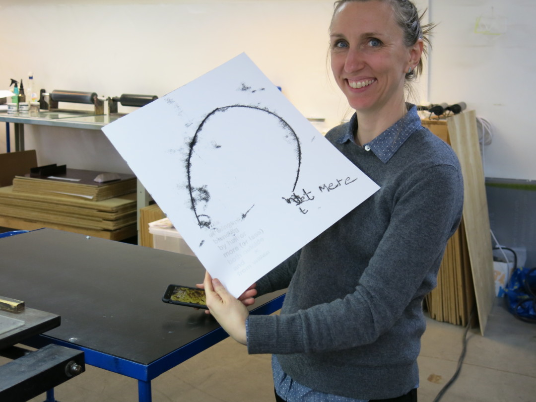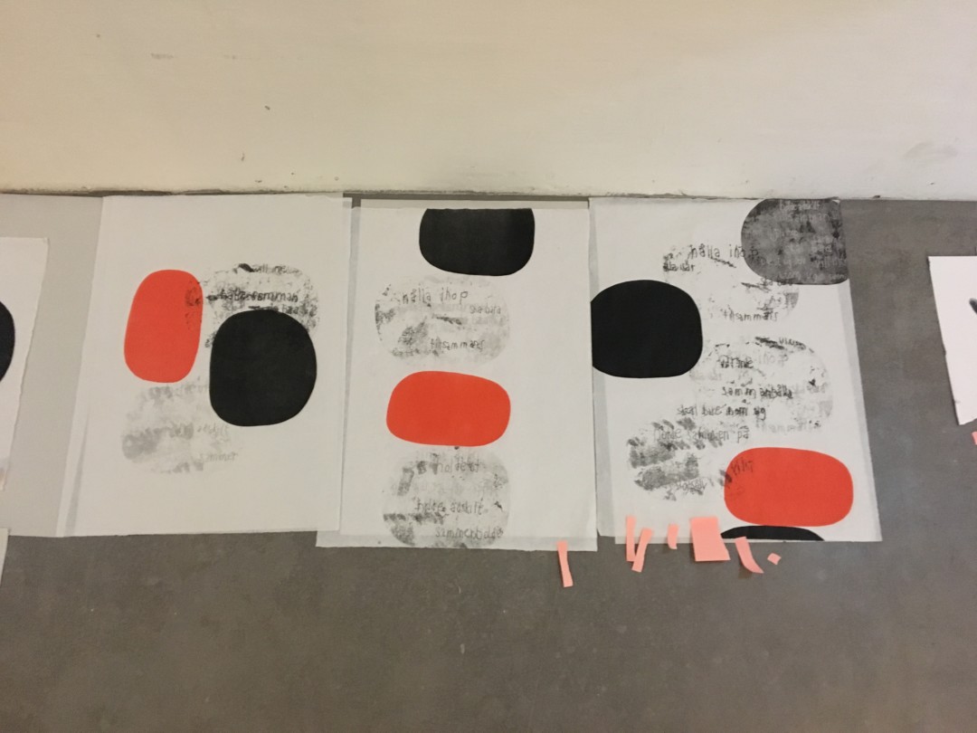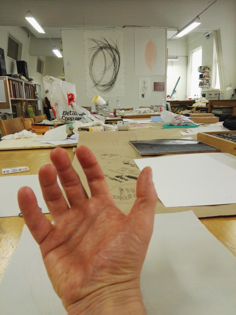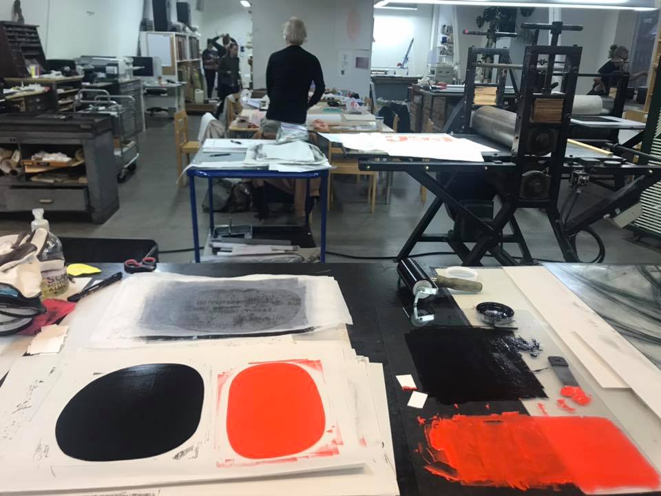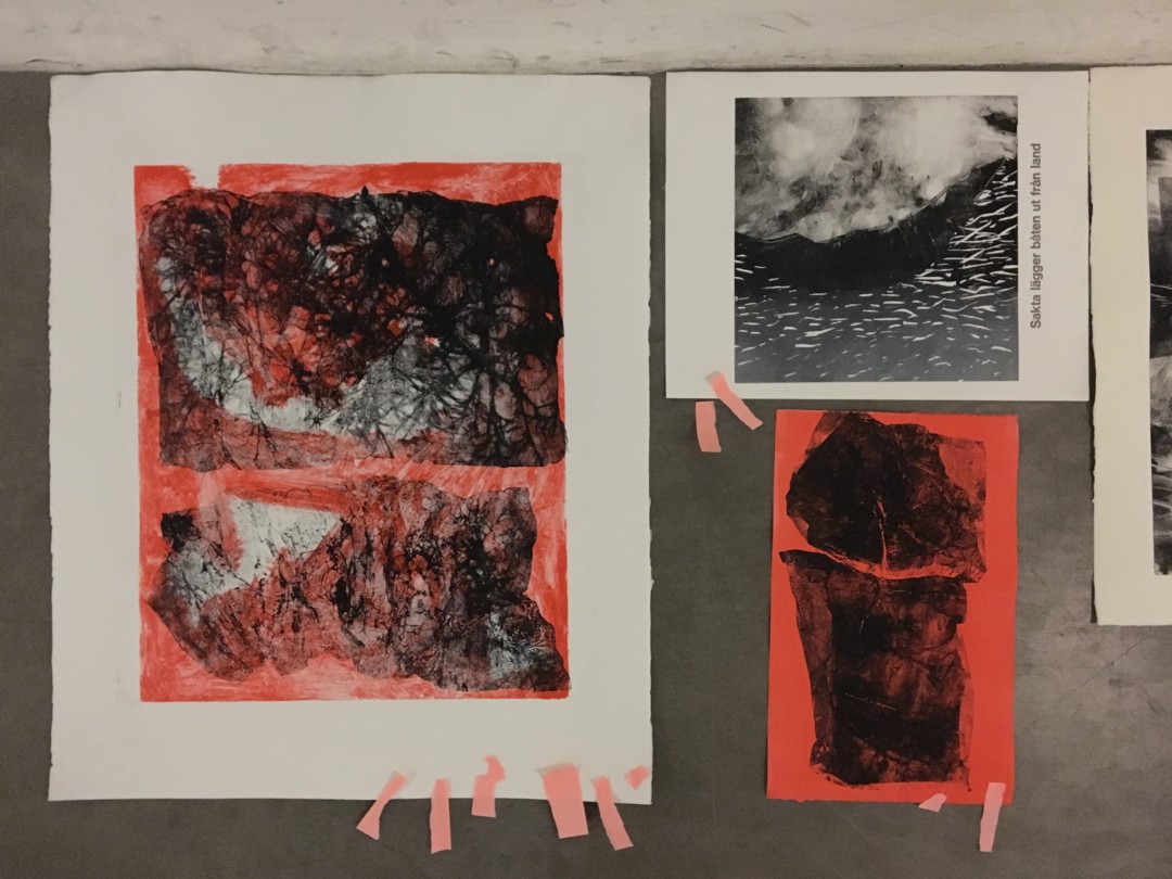 Cecilia Eneberg, Hilda Lindström och Anne Marte Overaa höll mest till i screentrycksverkstan. Några fokuserade på letterpressen och många av oss tryckte på den fantastiska elektriska djuptryckspressen. Det blev en hel del högtryck, stämpling, frottage. Men också gemensamma monotypier där bl.a Mette Borup Kristensen och Anne Louise fick ihop en vacker serie.