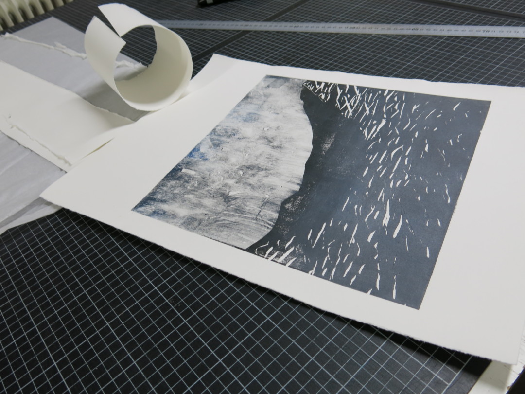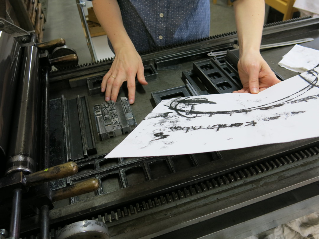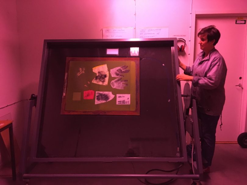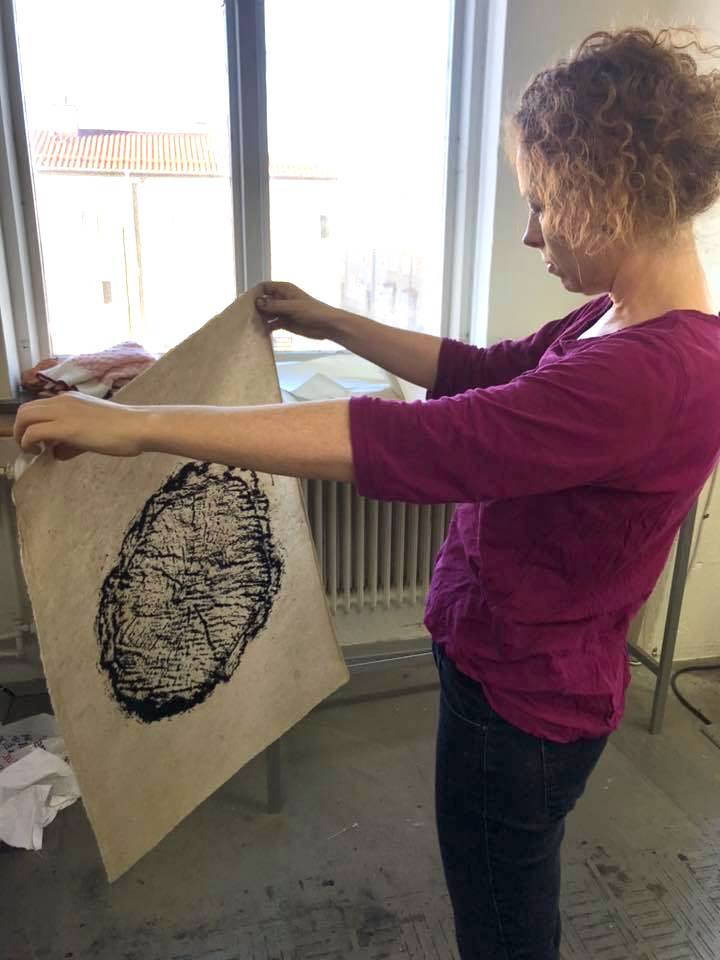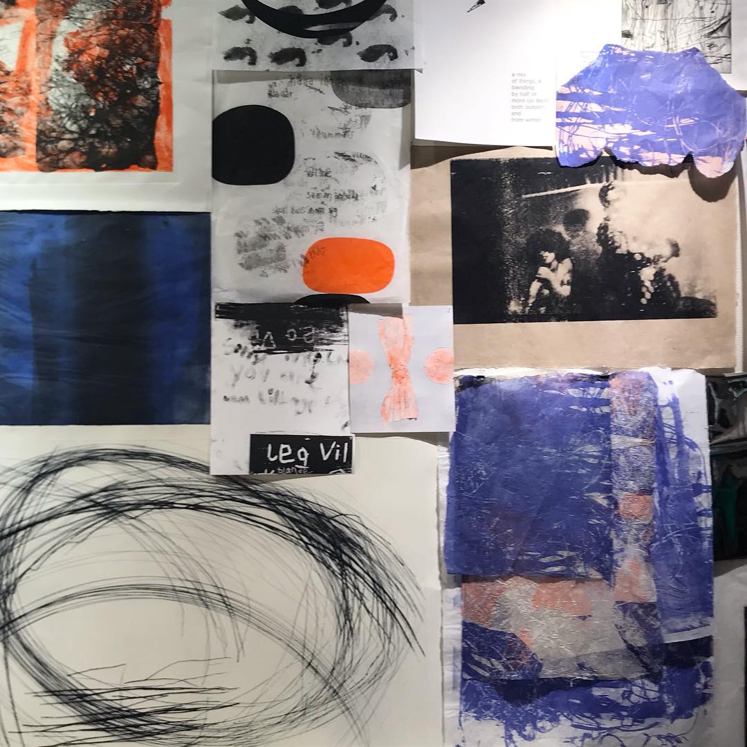 Cecilia Eneberg, Hilda Lindström och Anne Marte Overaa höll mest till i screentrycksverkstan. Några fokuserade på letterpressen och många av oss tryckte på den fantastiska elektriska djuptryckspressen. Det blev en hel del högtryck, stämpling, frottage. Men också gemensamma monotypier där bl.a Mette Borup Kristensen och Anne Louise fick ihop en vacker serie.