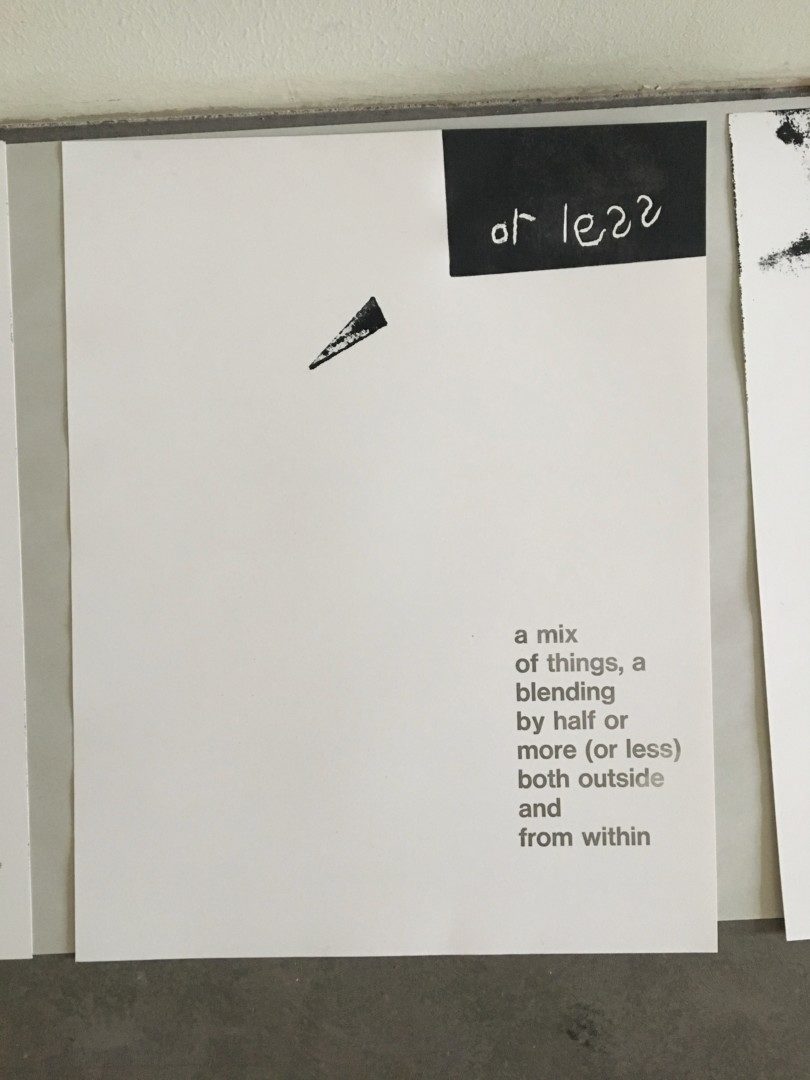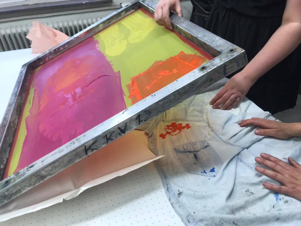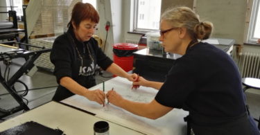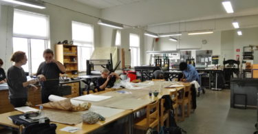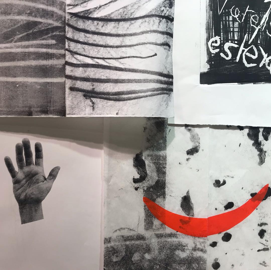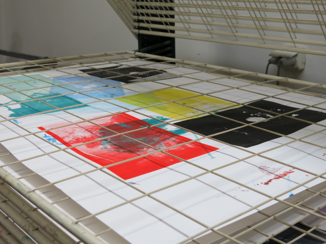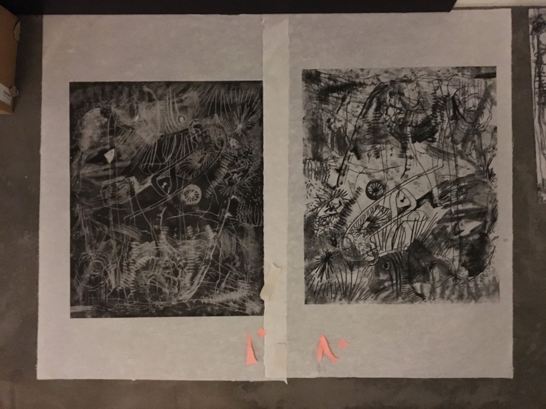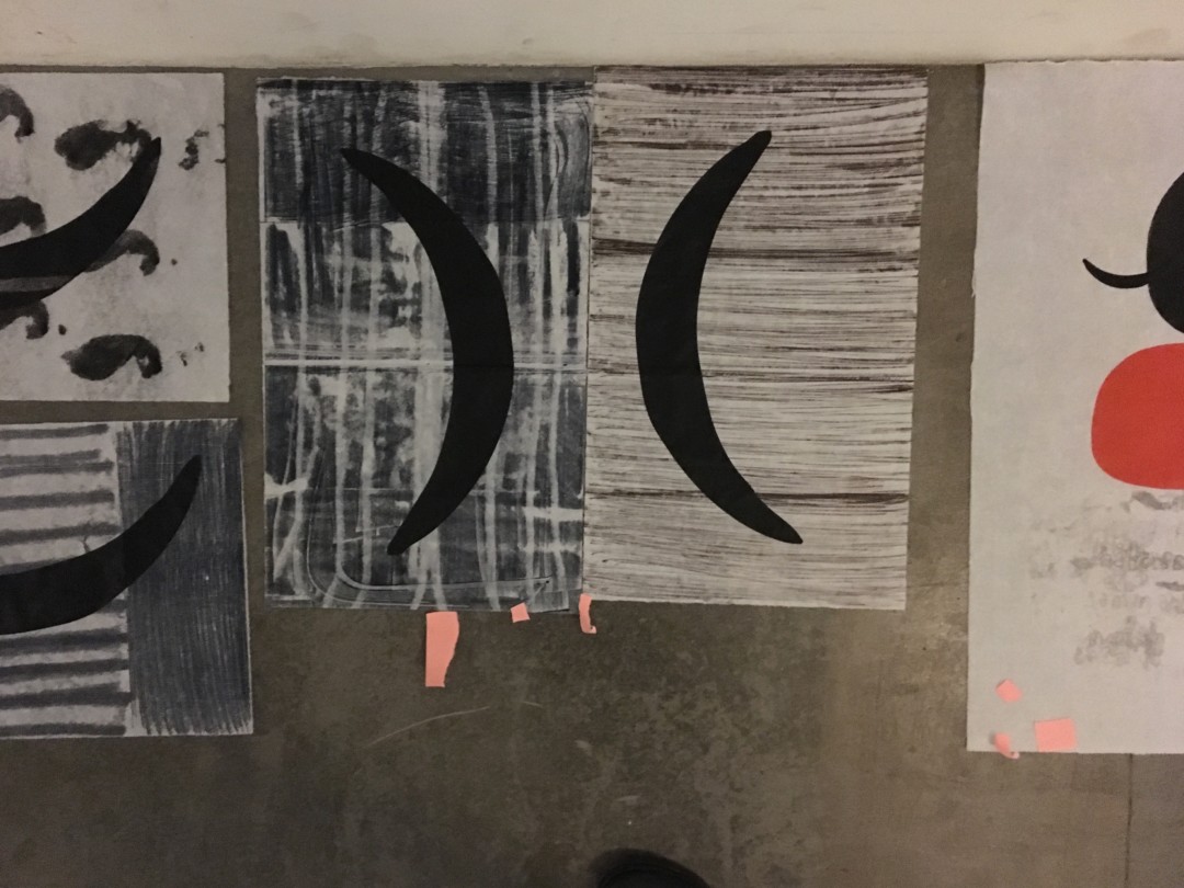 Cecilia Eneberg, Hilda Lindström och Anne Marte Overaa höll mest till i screentrycksverkstan. Några fokuserade på letterpressen och många av oss tryckte på den fantastiska elektriska djuptryckspressen. Det blev en hel del högtryck, stämpling, frottage. Men också gemensamma monotypier där bl.a Mette Borup Kristensen och Anne Louise fick ihop en vacker serie.