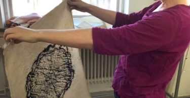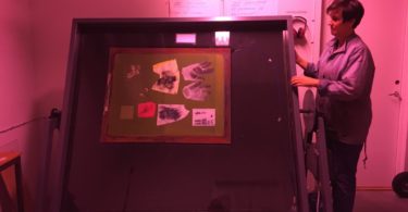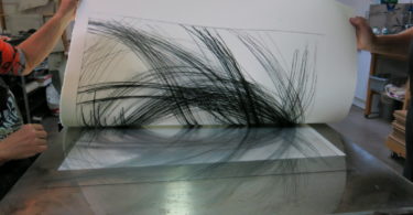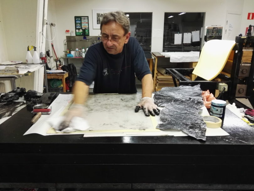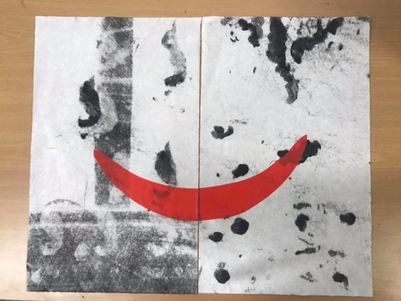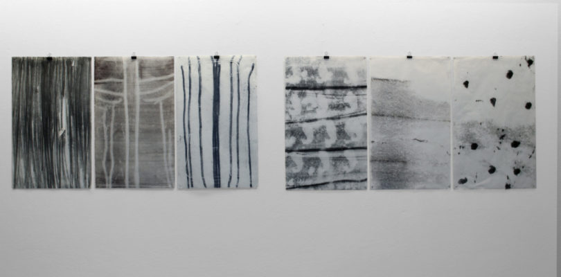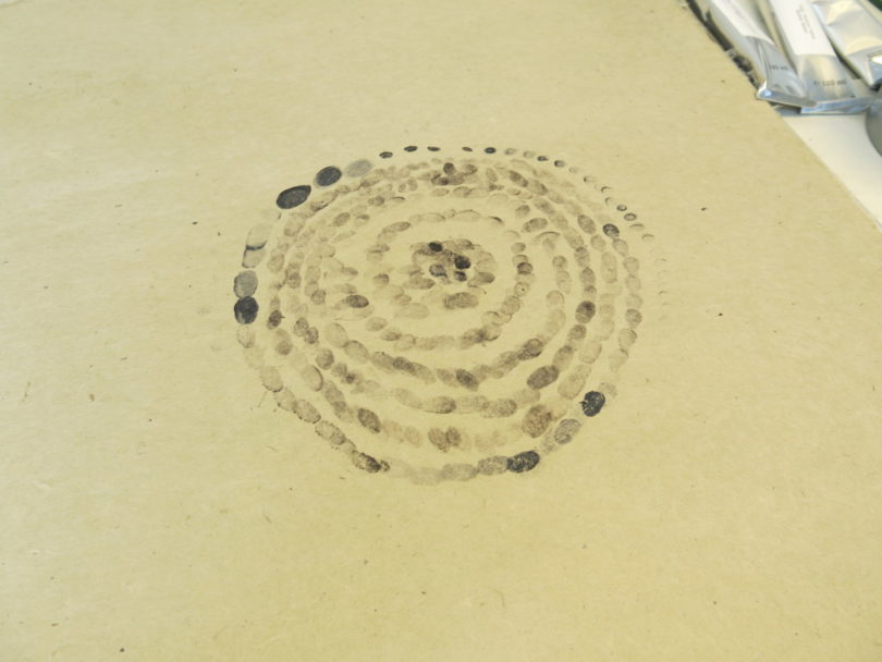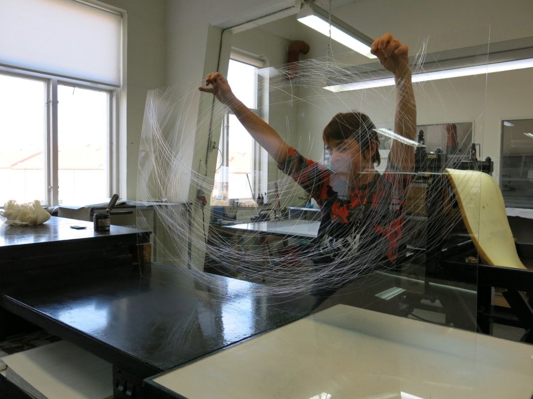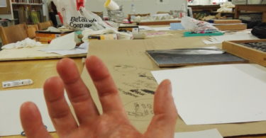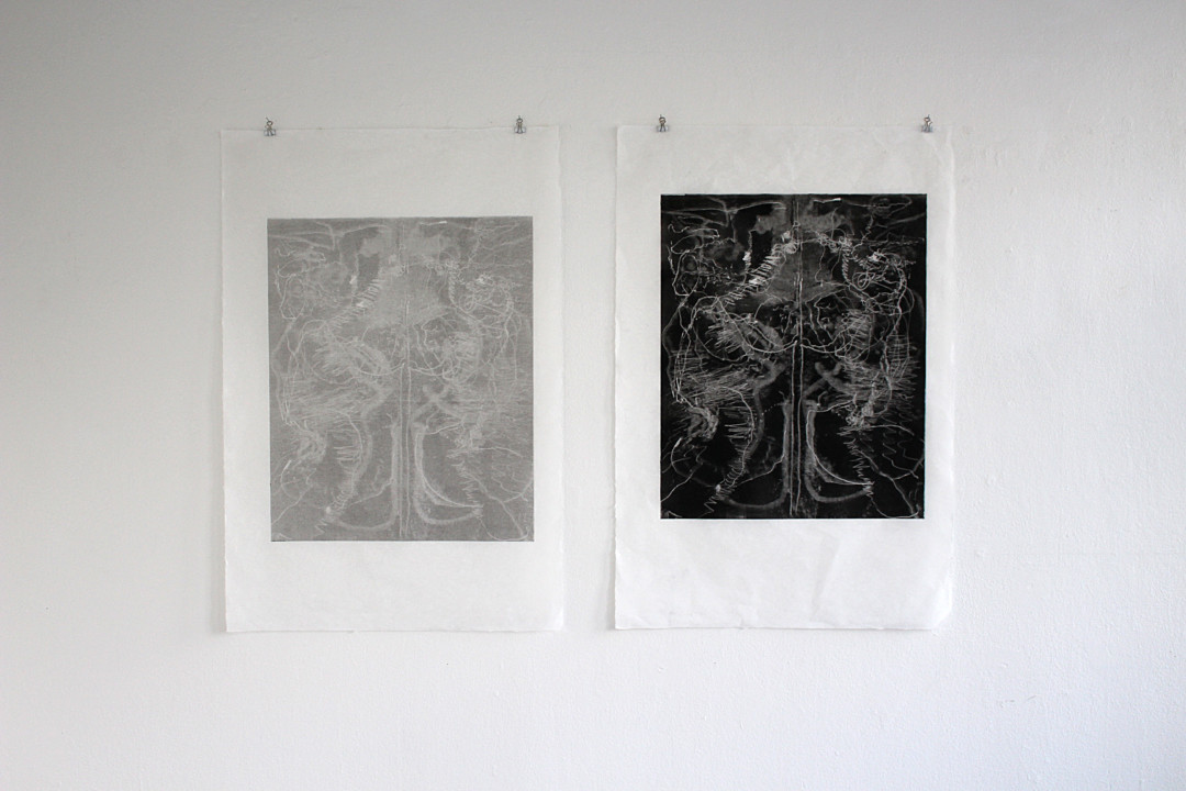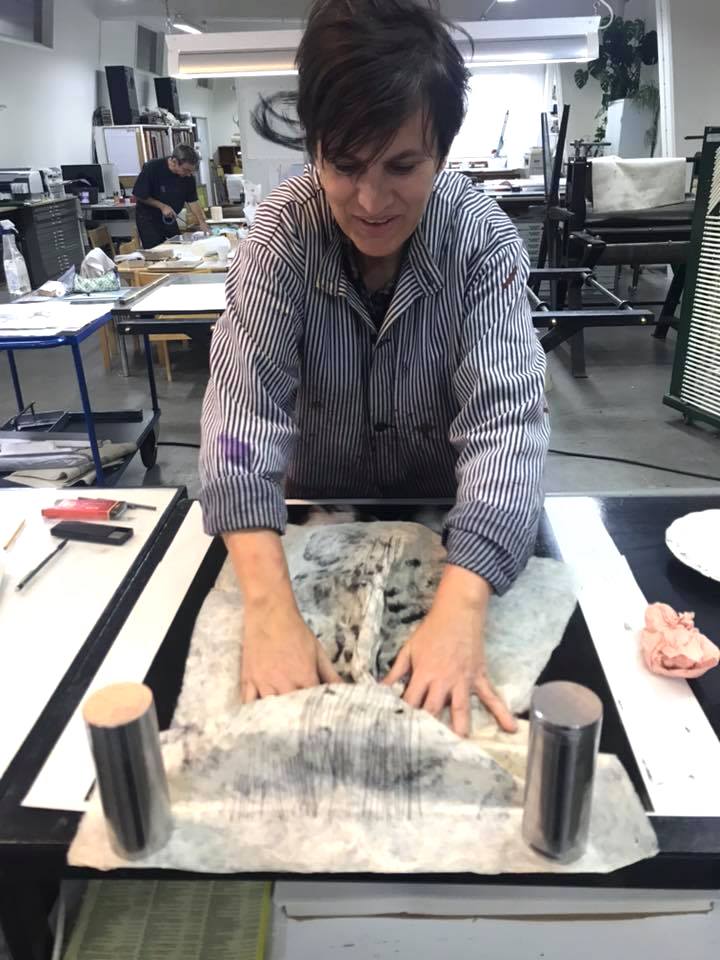 Cecilia Eneberg, Hilda Lindström och Anne Marte Overaa höll mest till i screentrycksverkstan. Några fokuserade på letterpressen och många av oss tryckte på den fantastiska elektriska djuptryckspressen. Det blev en hel del högtryck, stämpling, frottage. Men också gemensamma monotypier där bl.a Mette Borup Kristensen och Anne Louise fick ihop en vacker serie.