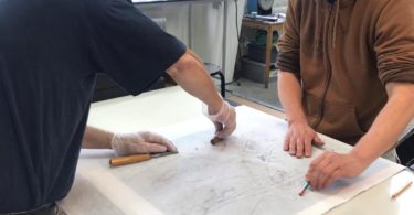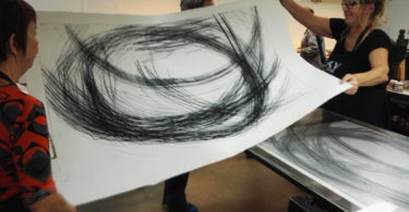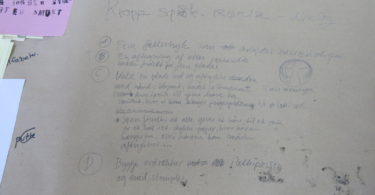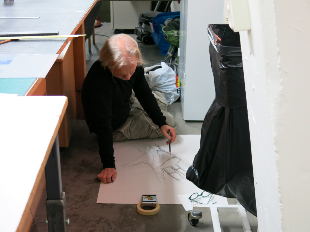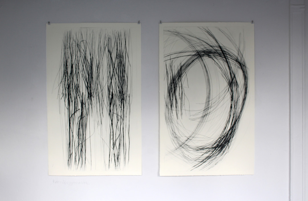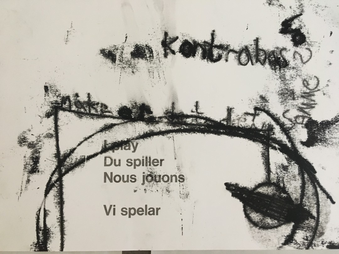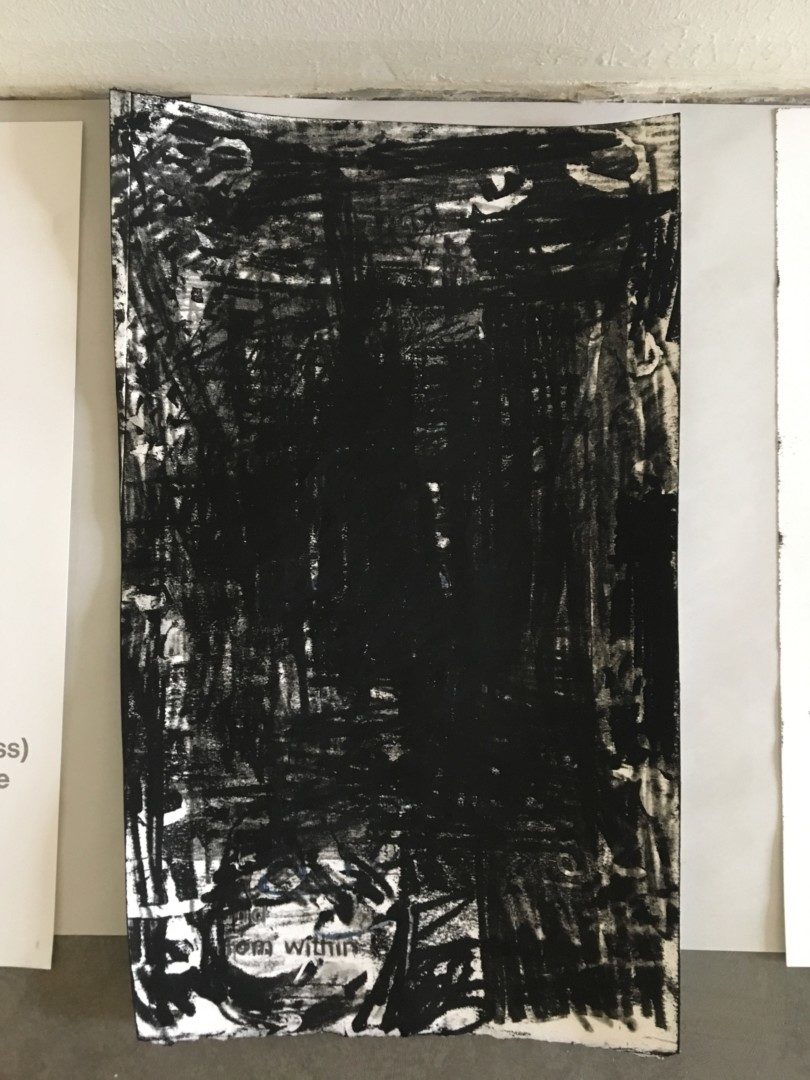 Vi hade därefter en gemensam övning där vi alla använde kroppen och tecknade fysiskt tillsammans och förhöll oss till vår partner på andra sidan bordet. (På liknande sätt jobbade vi sedan med monotypi på KKV i Malmö).