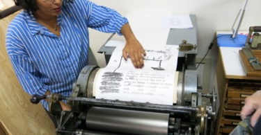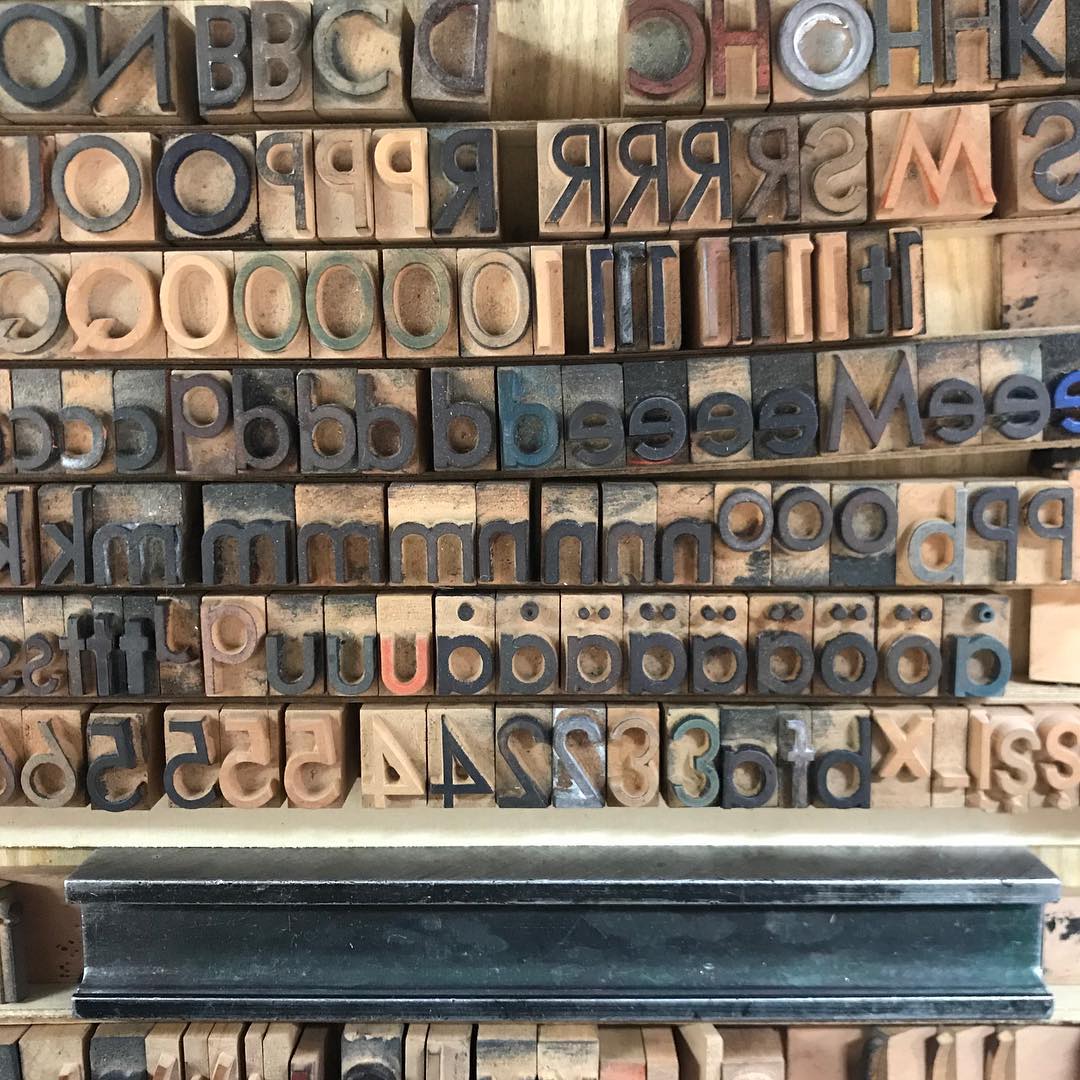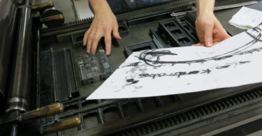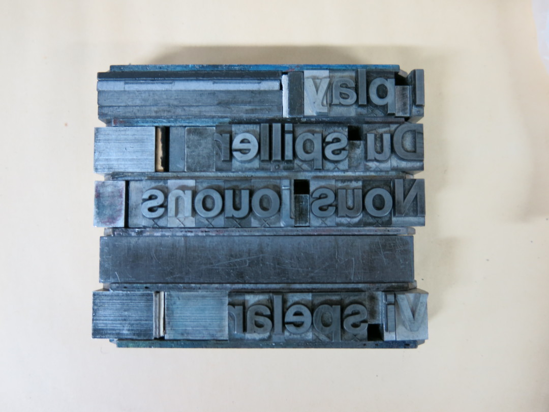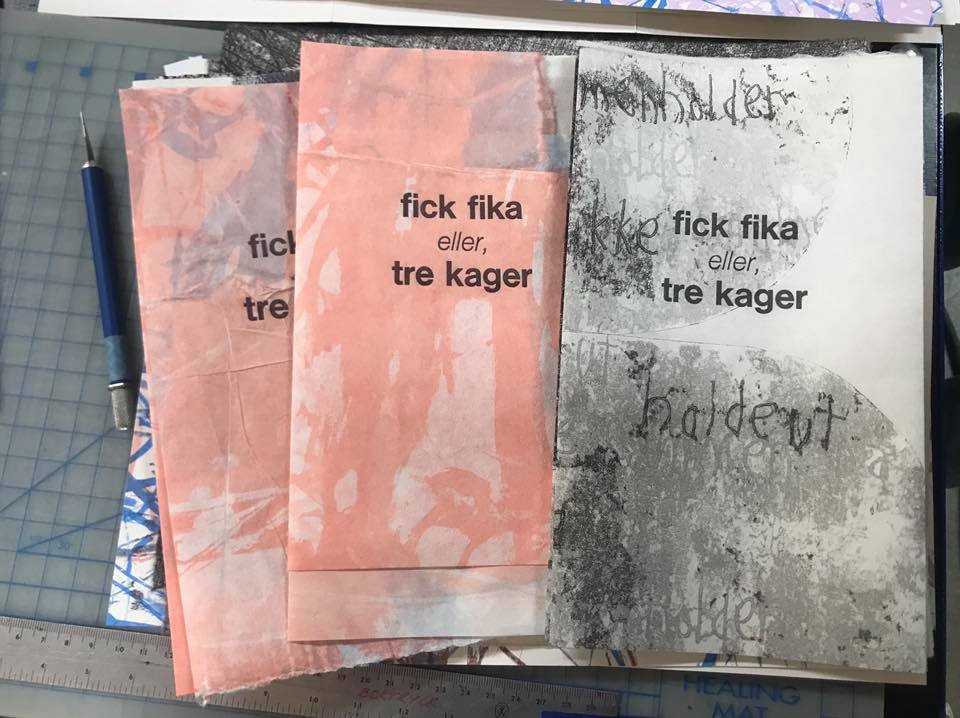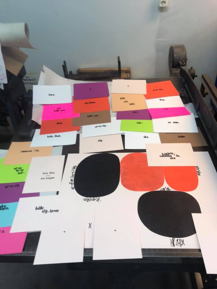 Alla tryckte med olika tekniker och bytte blad med varandra. Att trycka på varandras grafik tar emot lite men snart var vi igång. I en gemensam hög lades all grafik som vi kunde trycka vidare på. Trycken sattes in i Letterpressen och fick text. Och tvärtom. Alla experimenterade hej vilt. Ibland hade någon en idé och så gick alla igång och prövade det gemensamma projektet.