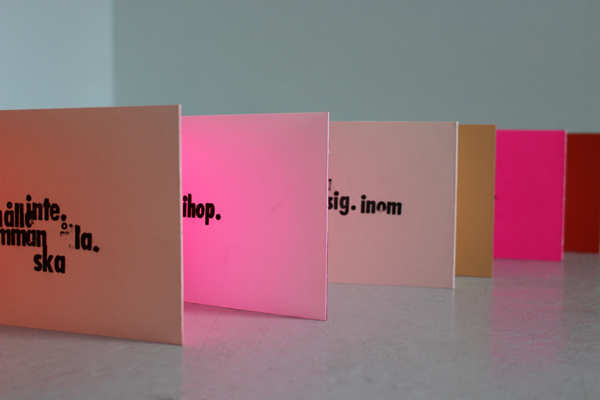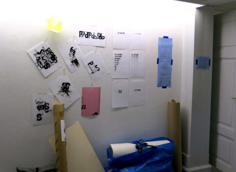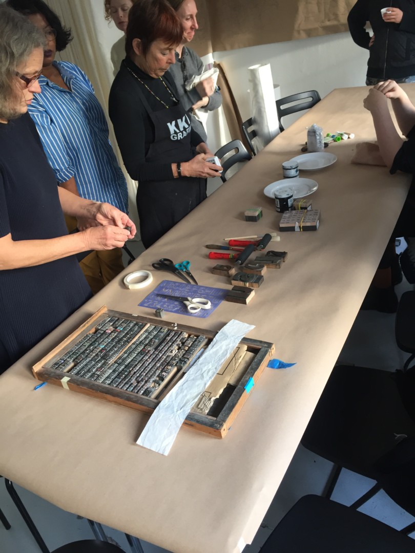 Därefter visade Åse Eg Jørgensen exempel ur böcker och artist´s books och pratade om bokstäver och språk. Vi prövade därefter att stämpla med olika typsnitt och det sattes upp på väggen. Väldigt roligt. Dessa texter införlivades senare i våra gemensamma artist´s books.