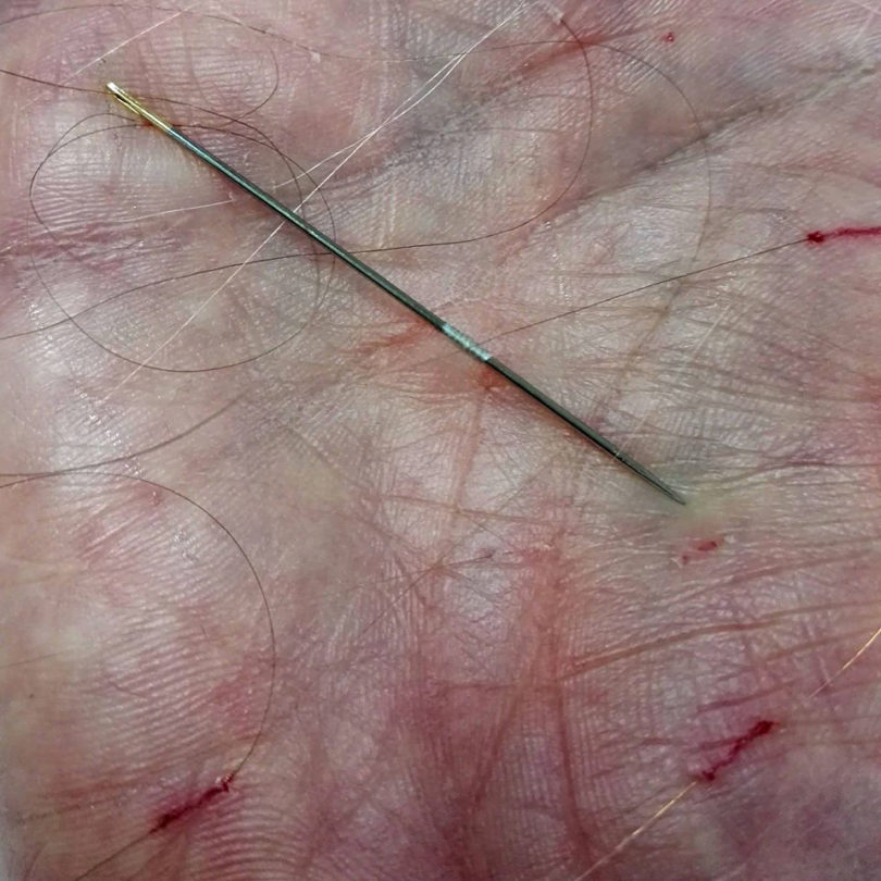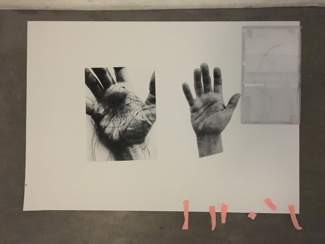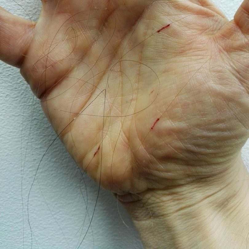 Her spurgte jeg de andre om de ville deltage i mit projekt, ved at trække et hår ud af deres hovedbund og donere det til mig. Efterfølgende syede jeg alle hårene ind i min hånd, for på den måde at få de andre ind under huden. I forbindelse med denne performance lavede jeg et værk med titlen ”Tørnålsradering med hår under hud”, hvor min hud er papiret, synålen den grafiske tørnål og hårene de grafiske streger.