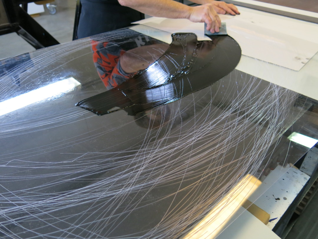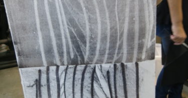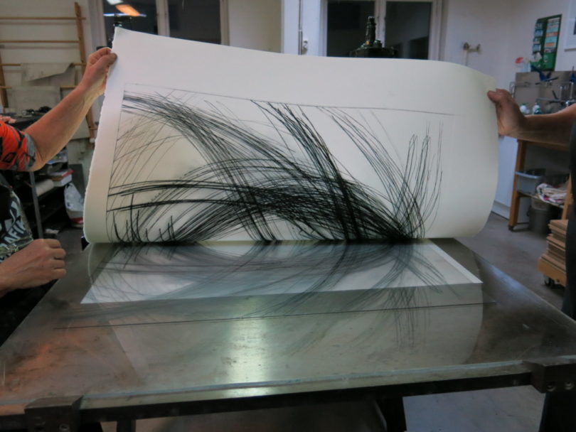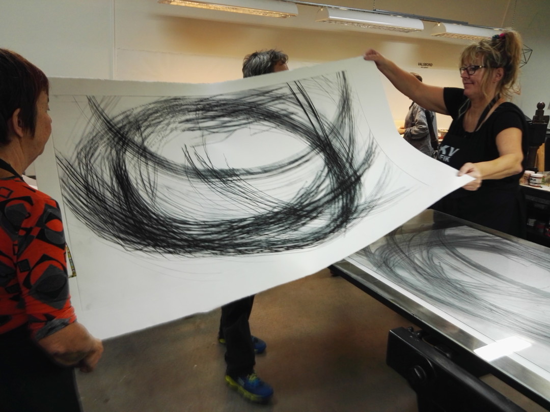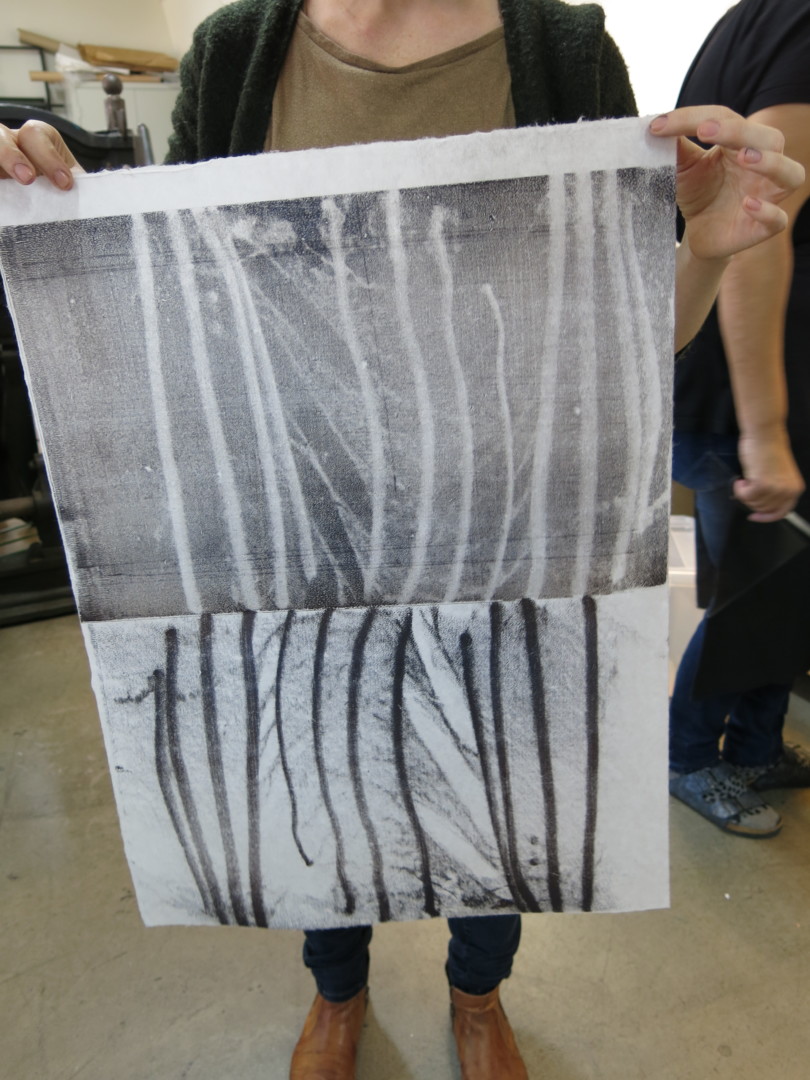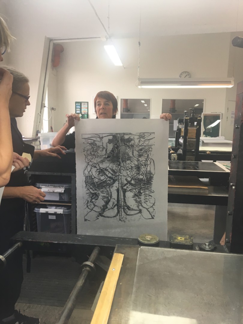 Christel Hansson som är van torrnålstryckare, tog sig an våra plastskivor där vi ristat på två olika sätt utifrån kroppens rörelse – ”torrnåls-gymnastik”. Linjerna blev varierande då vi tryckte olika hårt utifrån vår egen kropp. Blev två stora vackra blad.