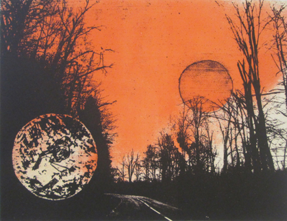 Landskapet runt omkring mej sätter spår i mina bilder. Jag bor nära Vänern och Halleberg. Även den grafiska processen kan göra att det händer just då och blir en vidareutveckling.