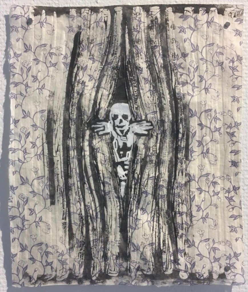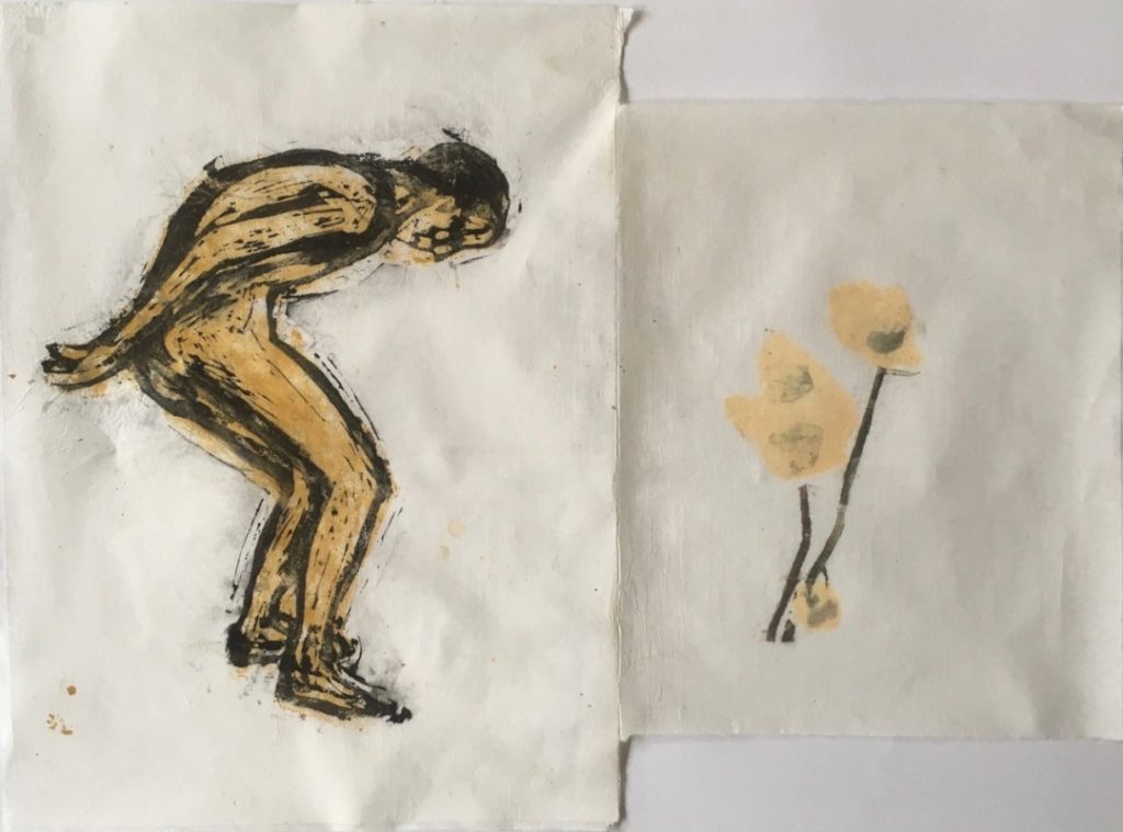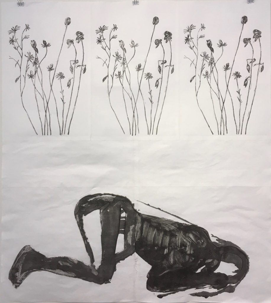 De vissna blommorna står hemma i köksfönstret, ständigt inspirerande. Andra inspirationskällor är Louise Bourgeois, Breughel och Bosch, Kiki Smith. Stora tuschteckningar på offer efter vulkanutbrottet i Pompeji som jag gjorde till en tidigare utställning gav upphov till idéen att göra de stora figurtrycken på den här utställningen.