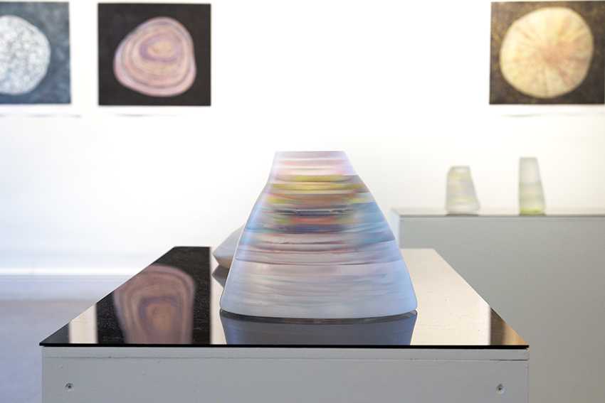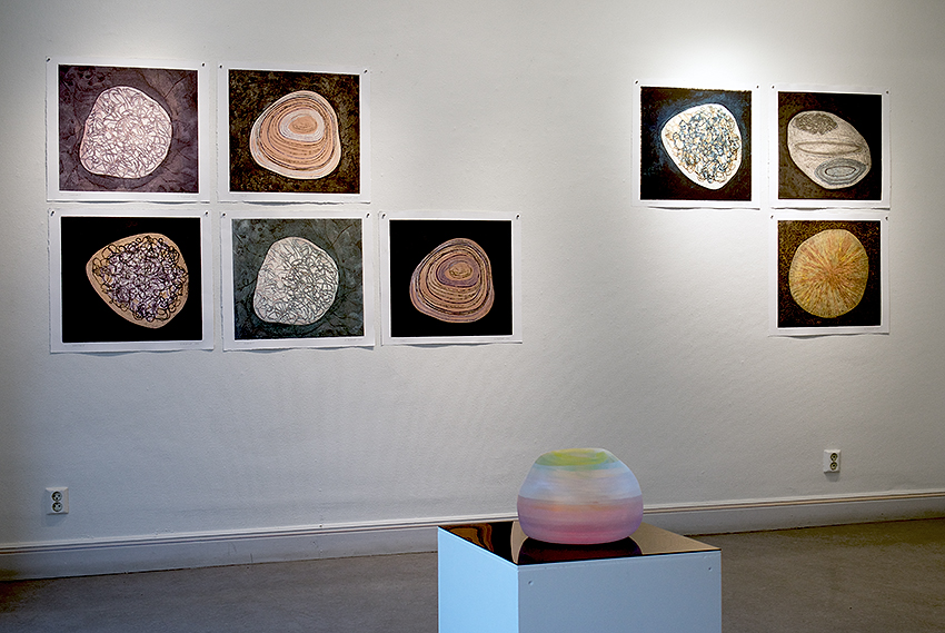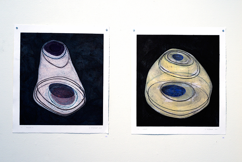 Man ser monotypier med motiv som påminner om stenar, öar, former och med titlar som Silur, Kambrium, Ordovicium, Diatom o.s.v. Tillsammans med de grafiska verken ser man skulpturer vilande på podier som påminner om öar/ljuskroppar.