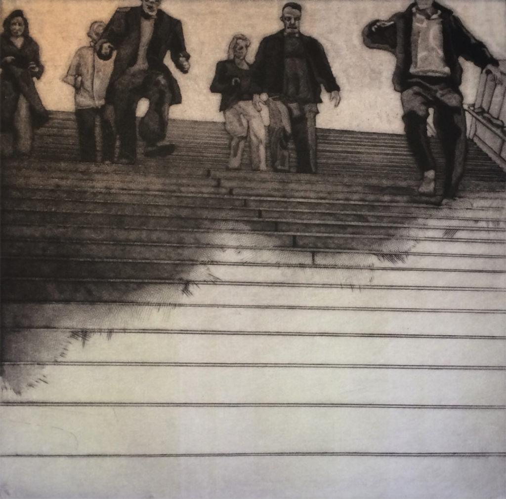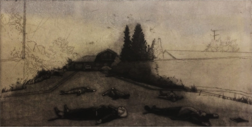 Under selve arbejdsprocessen med at lave pladerne, som er den proces jeg bruger mest tid på, tænker jeg ikke, der arbejder jeg bare. Inden jeg går i gang med pladerne, planlægger jeg alt det jeg kan. Jeg finder locations, skuespillere/karaktere, finder tøj til dem, og udarbejder scener. Jeg filmer, hvilket er det mest besværlige, men nok også det sjoveste. Der skal alt falde i hak, fordi jeg bruger andre menneskers tid, og jeg vil nødig spilde den. Jeg har haft en rigtig dejlig gruppe mennesker at arbejde med til de her billeder. Det var nogle rigtig gode optage dage. Dernæst udvælger jeg de billeder, som bedst fortæller det jeg leder efter – det ved jeg oftest først hvad er når jeg ser dem. Så printer jeg dem ud i faktisk størrelse, præparer min plader, overfører motivet og går i gang. Det mest nervepirrende er når jeg skal lave de første prøvetryk – det er lidt som at gå til eksamen.