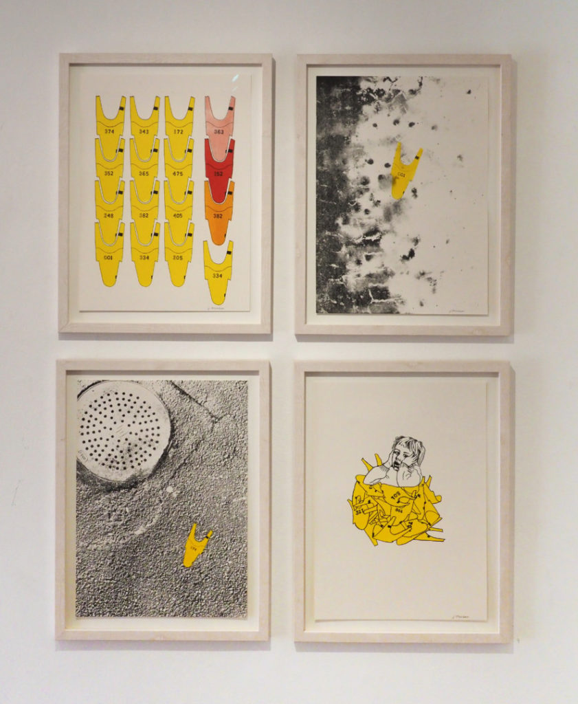 Johanna: De flesta verken är tryckta i offsetlitografi där jag först tecknat för hand eller digitalt och sedan överfört illustrationen till plåten. Jag ställer även ut stenlitografier där jag tecknat på stenen med kritor, samt en etsning där jag gjort en acetonöverföring från en teckning.