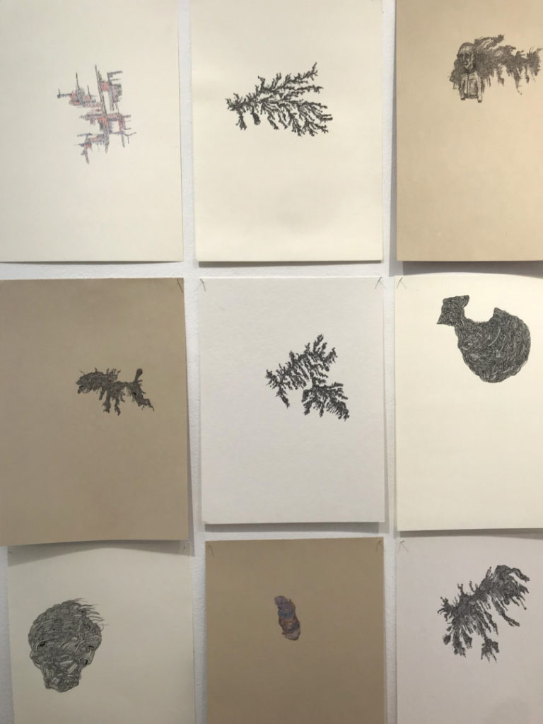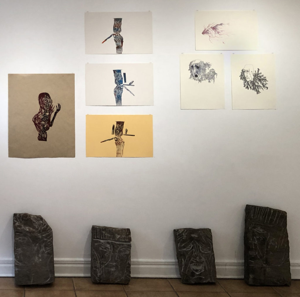 William: En stor mängd verk, jag arbetar mest med linjer, mönster, förvrängda gubbar och texter. Mina mönster tenderar att vara väldigt små på pappret. Jag ställer även ut fyra stenskulpturer.