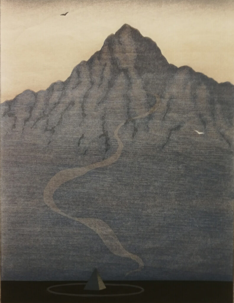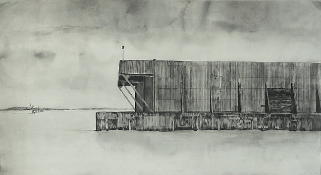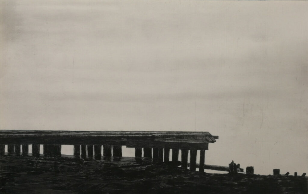 Hon blir som starkast i några stora gravyrer där hon reducerat det mesta och kvar på bildytan finns övergivna byggen som i ”Vid floden” och i ”Vandring på isen”. Allt har passerat, användningen av byggnaderna är borta . Där finns en stillhet i hennes poetiska dystopier. Den svarta färgen och den horisontal/vertikala bilduppbyggnaden är viktig och hjälper till att skapa den lugna, dova och laddade stämningen.