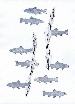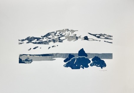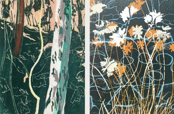 Working in black and white and long-landscape format, Ulla-Carin Winter and Wendy Rhodes are united by places beside water. They have chosen to interpret the remains of industrial activity, nature’s reclaiming of them, and the reflections they make in passing rivers. Ulla-Carin and Wendy say they “have exchanged experiences about graphic techniques, black printing ink and given each other good advice in creative processes.”