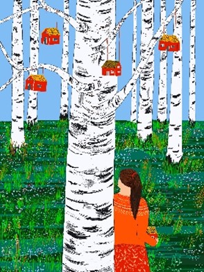 Working in response to a woodcut of a view of trees sent by her print partner Lotta Döbling, Anne Haworth, overlayed sketches made in Northumbria to form landscapes subsequently developed into 4-colour screen prints. The colour palette has now been adopted by Lotta to develop further prints for Anne to respond to.