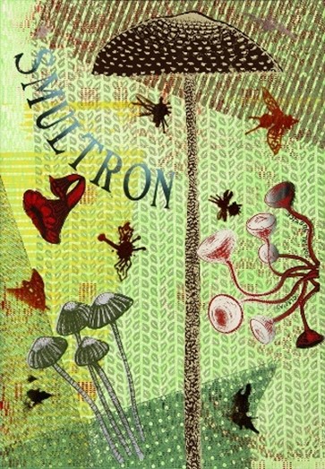Geometric, colourful, brickwork matrices of Eric Saline’s relief print have been overprinted by Christine Felce using screen printing and flock, giving a tactile quality, together with letterpress resulting in their joint prints entitled ‘Trespass’, reflecting the U.K.’s attitude towards access to the countryside, and ‘Smultron’ (Wild strawberry) that highlights the Swedish “allemansrätten” more open attitude.