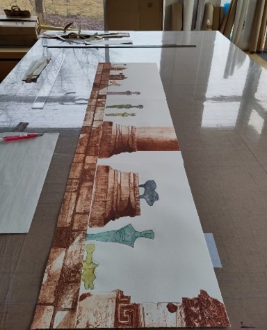 Whilst many have been inspired principally by nature, Ellen Cronholm and Emily Lucas have drawn upon ancient architecture, columns and carvings. Ellen sent Emily large-scale prints of ancient ruins and, after a visit to the Acropolis in Athens, Emily responded by sending Ellen monoprints of small figurines found in the ruins. These have been added to Ellen’s collagraphs as a nod to cultural heritage and the fact that antiquities can end up in the wrong places; Ellen says, “it is often the small, initially overlooked objects, that survive the longest”.
