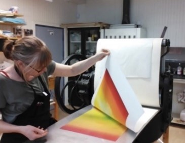 Kristina Thun and Jane Sasanow feel their collaboration is a ‘visual conversation’ with Kristina setting Jane a challenge of working with intense colours. Kristina says, “it feels fulfilling to work together, you are forced to think differently.” As a result, Jane has been exploring layered intaglio and relief processes.