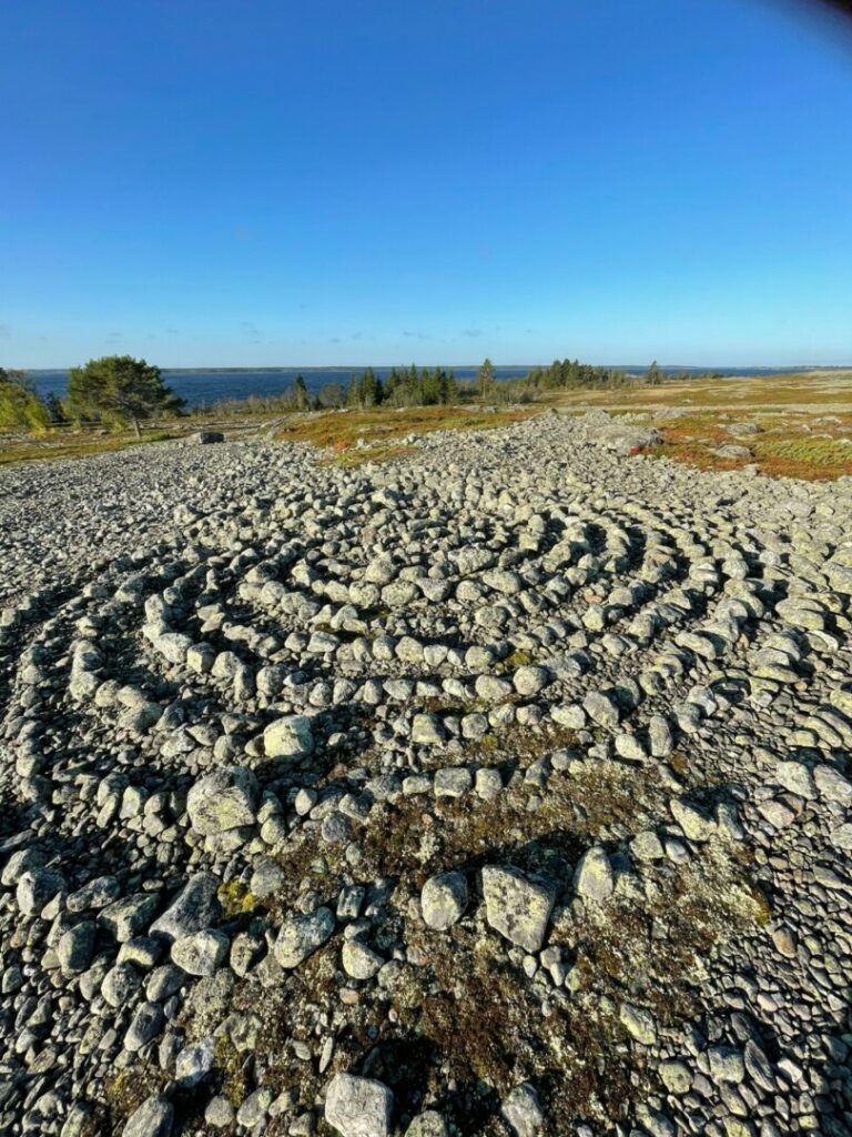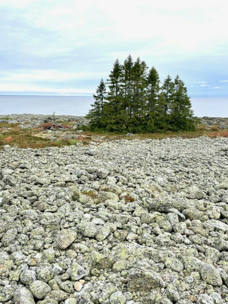 Trots att ön inte är stor behövde jag mina två veckor för att se allt. Det finns stigar ibland träspänger men mest av allt klapperstensfält. Rundslipade stenar i fåror som höjt sig upp ur havet med en landhöjningen på ca 1 cm om året. Här är kusten stenig och tämligen grund ovanligt för mig som är van vid Höga kusten i Ångermanland och Bohusläns släta klippor. Många nätter blåste det hårt och fönsterluckorna skallrade mot ytterpanelen. En kväll när vinden hade mojnat och vågorna lagt sig var det så tyst att tystnaden hördes. Det var nog den natten som jag sov så gott och norrskenet visade sig för den som var vaken. Tiden på ön använde jag till att vandra, spana men framför allt till att teckna. Det stilla tempot och vackra omgivningen gav ett lugn till koncentrerat arbete. För att trivas på ön måste man gilla stillhet, enkelt boende och väder och vind. Förutom för fyrvaktarna har ön varit tillhåll för fiskare och säljägare. Man kan se spår efter mänsklig hand genom de många labyrinterna och kompassrosorna som finns spridda på ön. Dessutom finns ett antal så kallade tomtningar, ett slags gömställen för säljägare. De har kunnat dateras till någon stans mellan 1400-talet och 1850 talet med hjälp av de lavar som växer på de fantastiskt fina stenarna som bildar klapperstensfält. För övrigt finns mycket ris för lingon, blåbär och kråkbär, lite sankmark och skog. Här och var finns granar i klungor som bildar öar på land. Egentligen är det en gran vars nedre grenar slagit rot och växt så det ser ut som fristående granar. Och så klart finns här stenar, stenar och åter stenar. Bra skor och ingen brådska rekommenderas. Till djurlivet räknade jag in massor av fåglar till ornitologernas förtjusning och harar, ormar, grodor, fjärilar och sälar (vikare) om du har tur. Jag såg endast nosen på en som dök. Alla sorters väder hann jag uppleva förutom högsommarvärme, snöstorm och drivis.