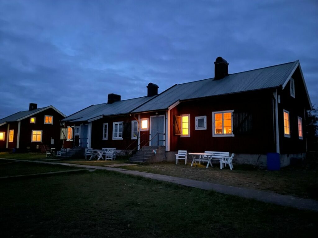 När fyren var igång bodde här fyra familjer. Det finns ett stort hus som byggdes till fyrmästaren och en länga med tre lägenheter byggda i omgångar. Idag drivs de som vandrarhem. Jag valde att bo i den södra delen med fin havsutsikt i tre väderstreck. Husen är rymliga och det mesta finns. Vatten hämtar man dock ute på gården.