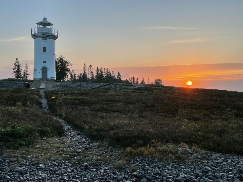 Vem vill inte åka till en ö mitt i norra Kvarken när hösten är som vackrast? Det ville i alla fall jag när det fanns tillfälle att söka residens på Stora Fjäderägg. Fyrön Stora Fjäderägg är trots namnet en liten ö ca 1,5 km tvärs över. Bara namnet gjorde mig nyfiken. Den ligger strax norr om Umeå och man tar sig dit med vägverkets minsta gula färja till Holmön och sedan vidare med mindre båt ca 30 minuter. Drygt 800 meter från hamnen ligger den ståtliga vita fyren från 1851. Den är numer privatägd och i full gång att renoveras till sommarviste av en man med visioner. En ”sommarstuga” i fyra plan där det översta är en 360 graders inglasad veranda med utsikt så långt det går. Där uppe får man en riktigt fin överblick över ön och i fjärran går fraktfartyg i 10 knop.