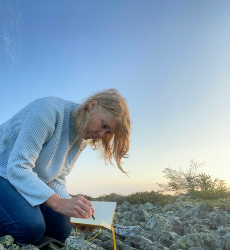 Jag satte mig på en stor sten nära vattnet, hundra mil hemifrån. Tog ett djupt andetag och började nynna på Pughs ”Små lätta moln…” Jag hade utgått från öns högsta punkt, gått över runda fina stenar, fortsatt på en väl upptrampad stig som övergick till en träspång. Sedan balanserade jag på stenar forserade genom lingonris och så var jag framme vid min sten. Himlen var blå och solen värmde. Över mig flög ett fågelsträck söder ut, ett svanpar paddlade iväg från mig.