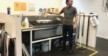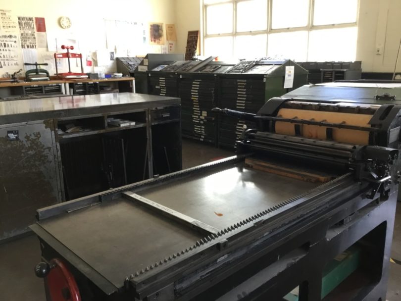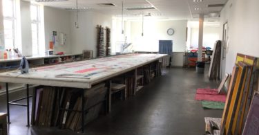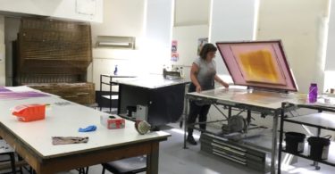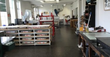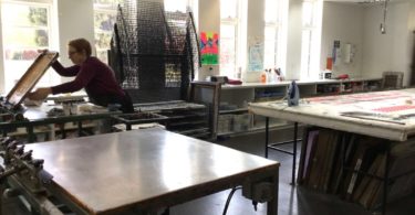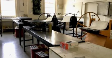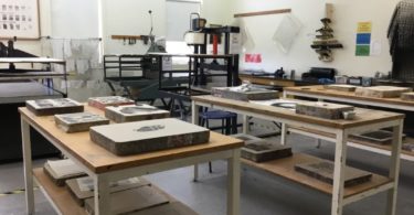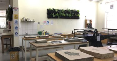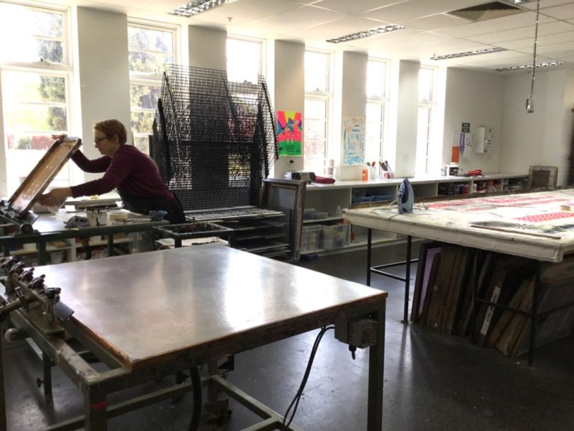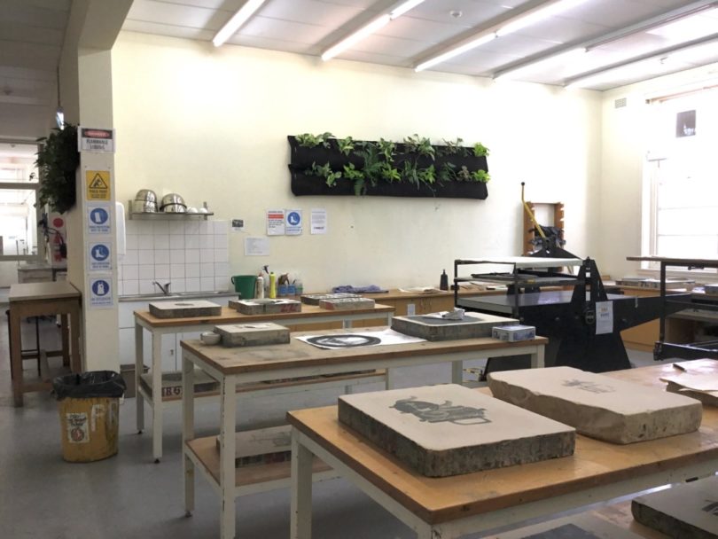 I entrén på universitetets konstavdelning träffade jag Allison. På andra sidan jordklotet. Det funkade! Hon visade mig runt i de stora lokalerna på universitetets grafikutbildning. Två våningar med avdelningar för stenlito, etsningsrum och pressar för djuptryck och ett stort utrymme för screentryck. En av lärarna hade ordnat med inomhusmiljön genom att placera växter som hängde från en specialgjord vägghängd tingest. Varför inte? Allt som tillför ett bra arbetsklimat kan inte vara fel.