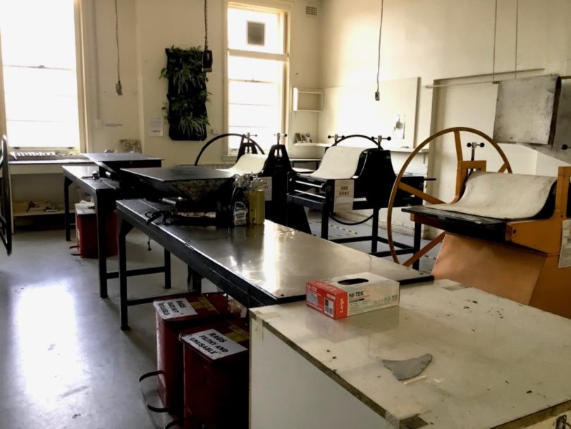 Innan jag åkte hemifrån tänkte jag att jag ville besöka en grafikverkstad i Canberra men kände ingen. Efter lite googlande och ett mejl till Alison Alder, grafiker, lärare vid Australia National University (ANU) och styrelsemedlem i den konstnärsägda grafikverkstaden Megalo Print Studio fick jag kontakt med henne redan dagen efter mitt sända mejl. Hon skrev: Welcome.