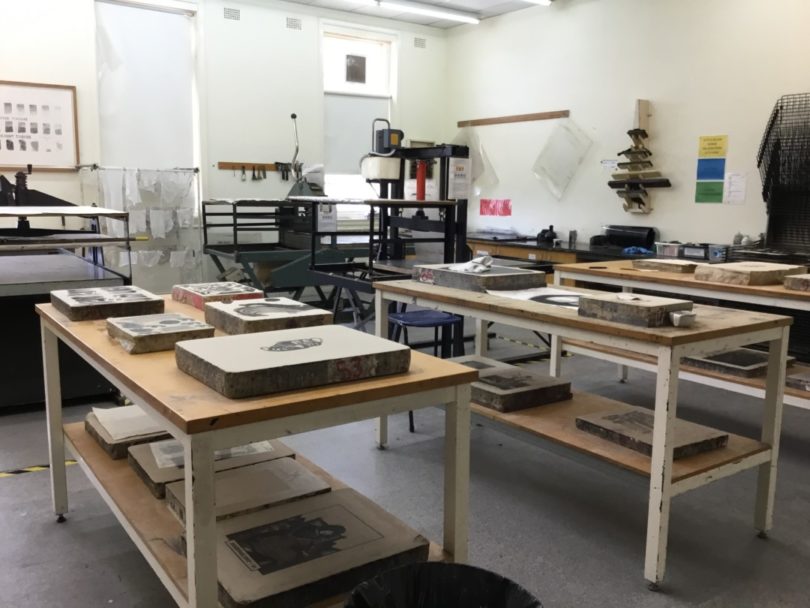 Allison erbjöd mig att följa med till en grafikverkstad en liten bit från universitetet på andra sidan den konstgjorda sjön som delar Canberra i två delar. Över bron förbi det pampiga biblioteket och regeringsbyggnaden. Strax efter National Art Galleri ligger Megalo Print Studio, konstnärsägd grafikverkstad. Här finns två anställda. Verkstan inrymmer en liten utställningshall och tryckrum för djuptryck, stenlito och screentryck för arbete på både papper och textil. Jag fick veta att de även har Artist in Residence. På hemsidan megalo.org kan du läsa om det och se mer av verkstaden och deras verksamhet.