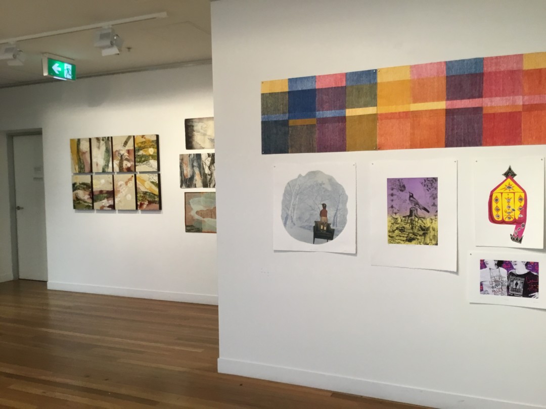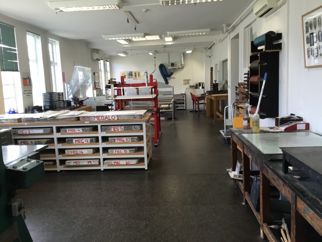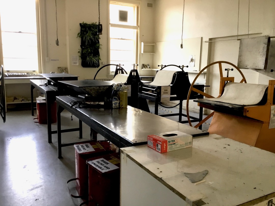 Allison erbjöd mig att följa med till en grafikverkstad en liten bit från universitetet på andra sidan den konstgjorda sjön som delar Canberra i två delar. Över bron förbi det pampiga biblioteket och regeringsbyggnaden. Strax efter National Art Galleri ligger Megalo Print Studio, konstnärsägd grafikverkstad. Här finns två anställda. Verkstan inrymmer en liten utställningshall och tryckrum för djuptryck, stenlito och screentryck för arbete på både papper och textil. Jag fick veta att de även har Artist in Residence. På hemsidan megalo.org kan du läsa om det och se mer av verkstaden och deras verksamhet.