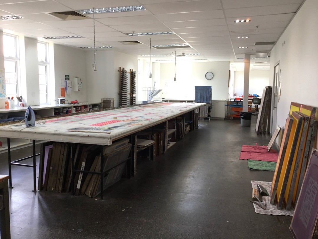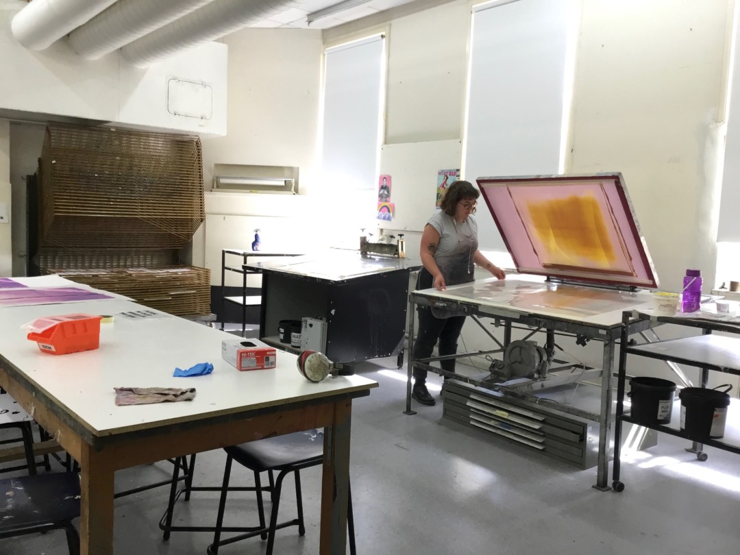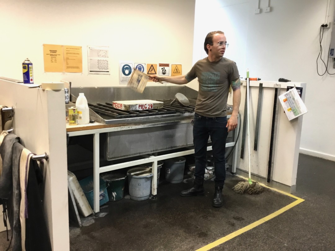 I entrén på universitetets konstavdelning träffade jag Allison. På andra sidan jordklotet. Det funkade! Hon visade mig runt i de stora lokalerna på universitetets grafikutbildning. Två våningar med avdelningar för stenlito, etsningsrum och pressar för djuptryck och ett stort utrymme för screentryck. En av lärarna hade ordnat med inomhusmiljön genom att placera växter som hängde från en specialgjord vägghängd tingest. Varför inte? Allt som tillför ett bra arbetsklimat kan inte vara fel.