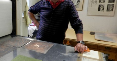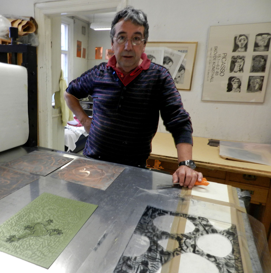 Nobert Robles , fransk konstnär som bor i Lund och på Ven. Han är medlem i Skaraborgs konstgrafiska verkstad sedan starten 1981.