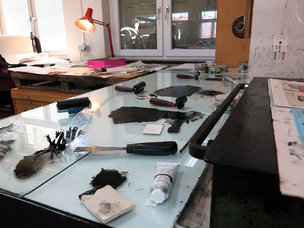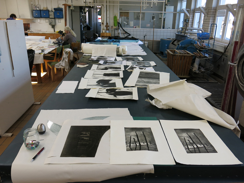 Jag har länge velat undersöka olika svarta tryckfärger i kombination med alla de djuptryckstekniker jag använder mig av. Svart är en kraftfull färg, den gör också att motivet koncentreras, blir tydligt och enkelheten i att bara använda svart fascinerar mig.