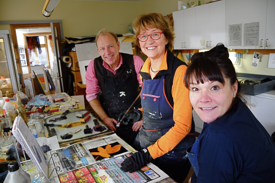 En mulen och regnig novemberdag kom Grafiska Sällskapets gallerister Catarina och Björn hit till oss i den lilla radbyn Blacksta mellan Gnesta och Mariefred i Sörmland, för att lära sig och se hur en collografi blir till.