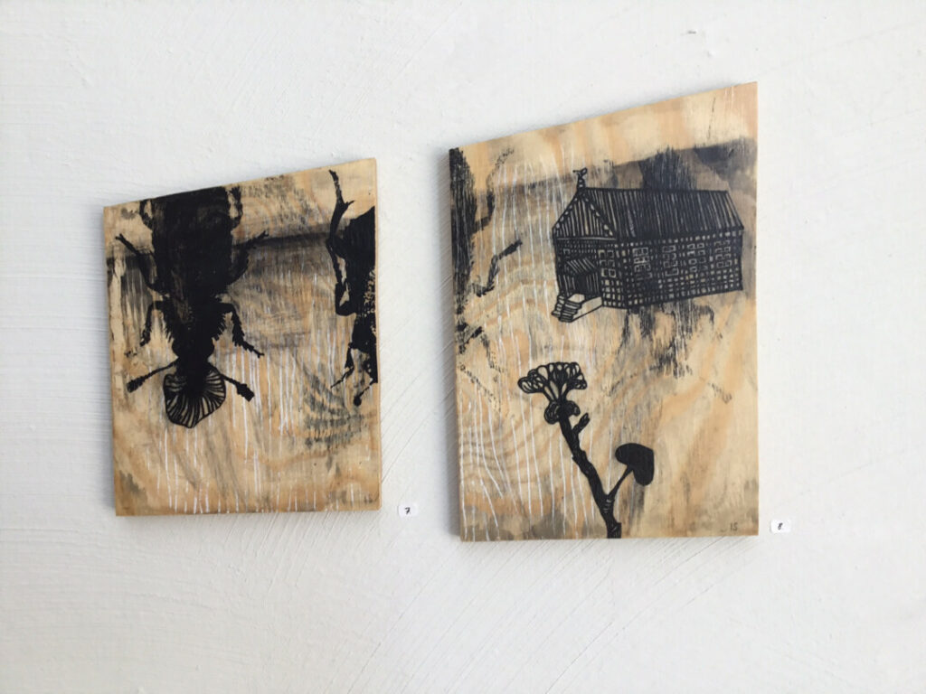 På Klippans konsthall visas nu Ingela Svensson bildkonst i form av mixed media: screen, collage av gamla linoleumsnitt och rester av teckning och måleri.